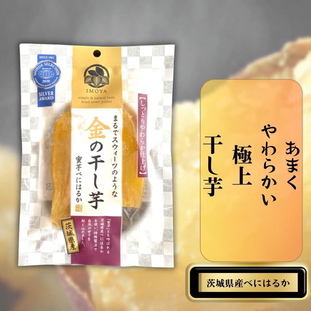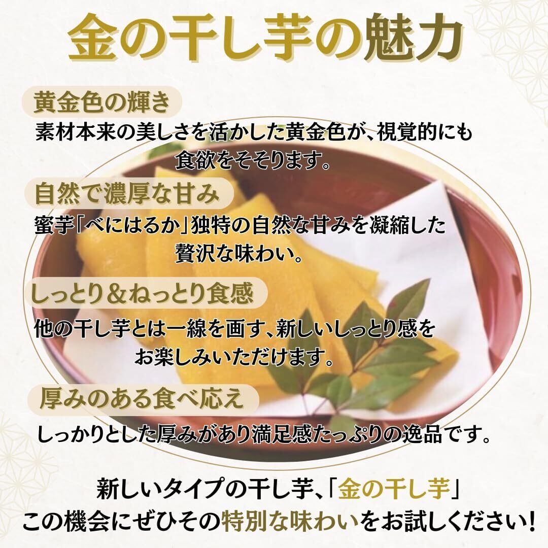 「『金の干し芋 茨城県産べにはるか』は、茨城県産の厳選されたべにはるかを使用し、無添加で仕上げた美味しい干し芋です!90g入りが5袋セットになっており、手軽に美味しさを楽しむことができます。」