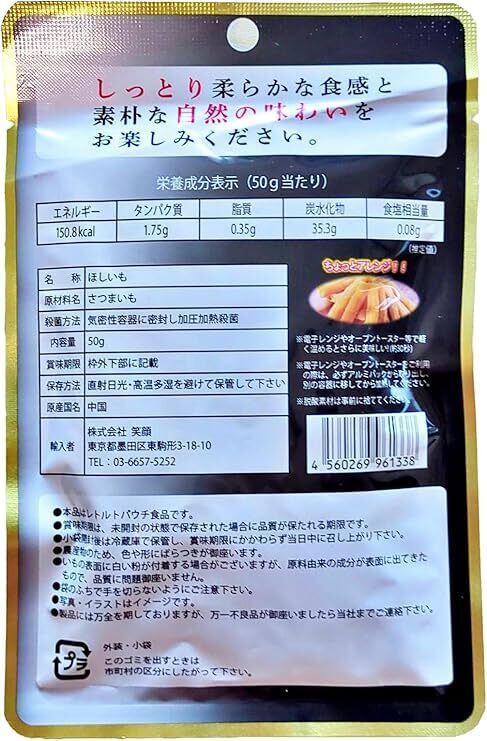 「『笑顔 しっとり焼き干し芋』は、厳選されたさつまいもを使用し、無添加で仕上げた美味しい焼き干し芋です!50g入りの袋が10袋セットになっており、手軽にそのまま美味しさを楽しむことができます。」