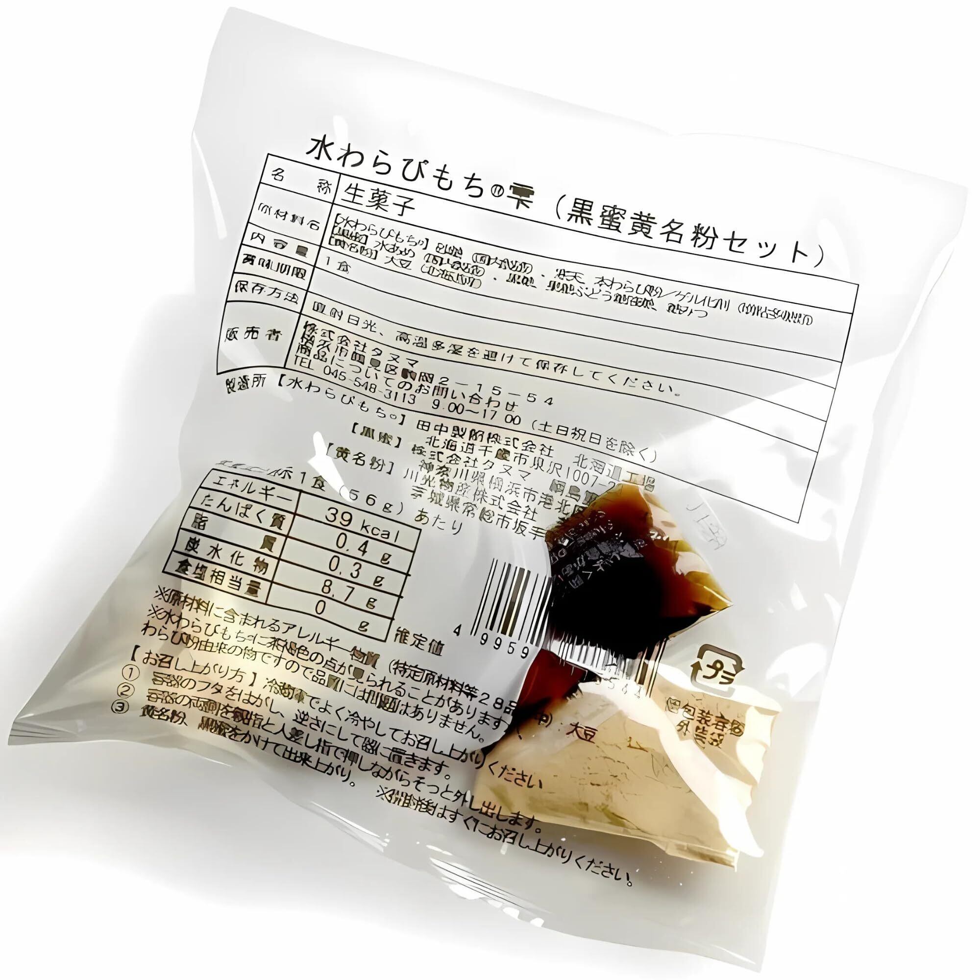 【水わらびもち雫®】砂糖(国内製造)、寒天、本わらび粉/ゲル化剤(増粘多糖類)【黒蜜】水あめ(国内製造)、黒糖、果糖ぶどう糖液糖、糖みつ【黄名粉】大豆(北海道産)