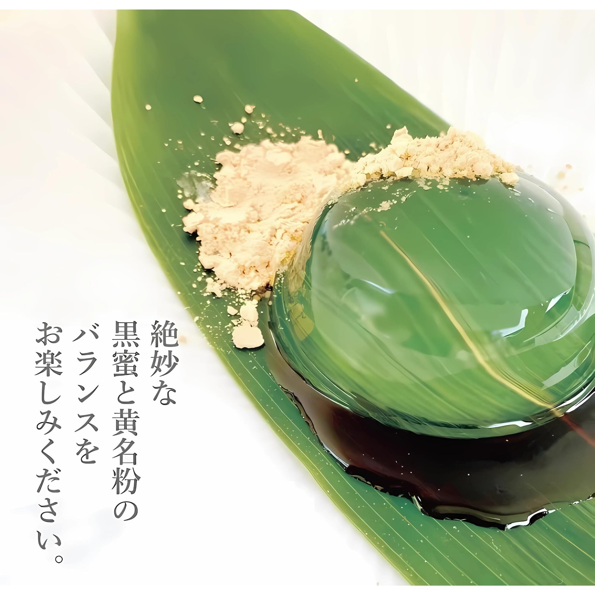 ひんやり、もっちり、のどごし爽やか。シロップに浸かった新食感、水わらびもちにトレンディーな新たな”かたち”。黒蜜と黄名粉のマリアージュでお楽しみください。黒蜜5gと黄名粉1gがセットになっております。