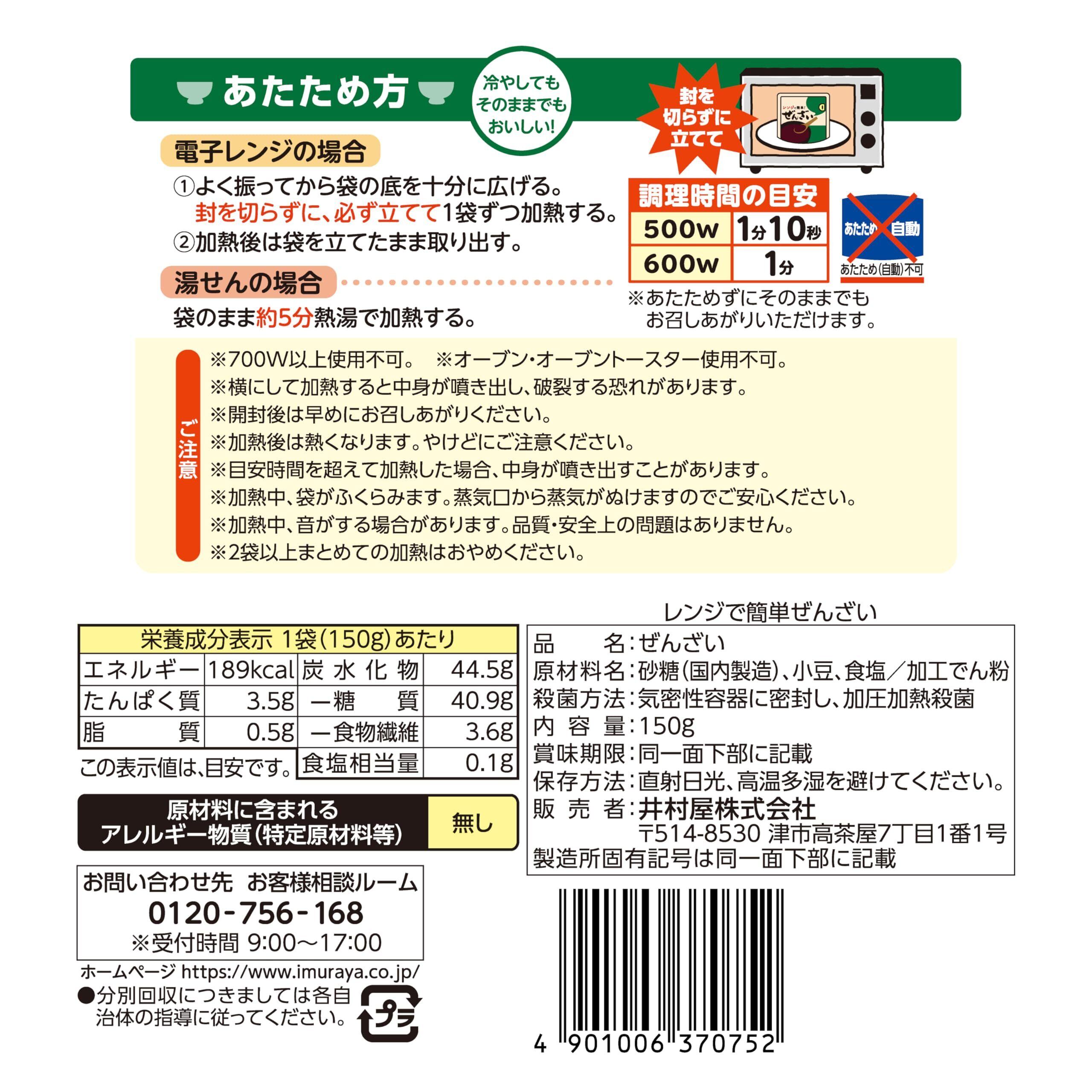 「『井村屋 レンジで簡単ぜんざい』は、厳選素材を使用した、風味豊かでリッチな味わいのぜんざいです!150gのパッケージが5個セットになっており、忙しい日常の中でも簡単に本格的なぜんざいを楽しむことができます。」