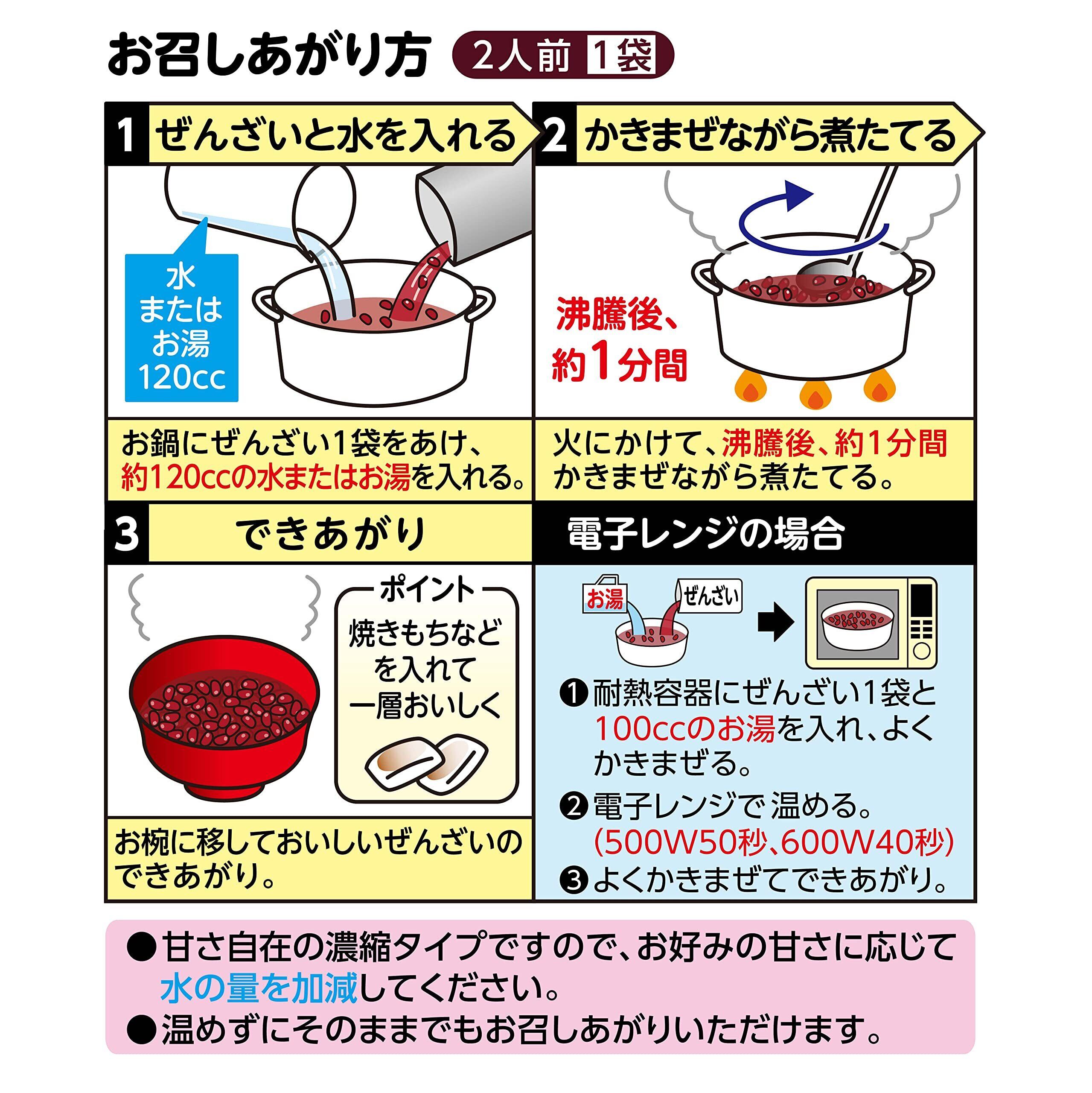 お好みの甘さや粘度に調節できる濃縮タイプのぜんざいです。2人前×2袋入りの小分けタイプで、使い勝手がよく便利です。素材のうまみを引き出す、まろやかな塩味の「赤穂の天塩」を使用しています。小豆の風味豊かなコクのあるぜんざいをお楽しみいただけます。