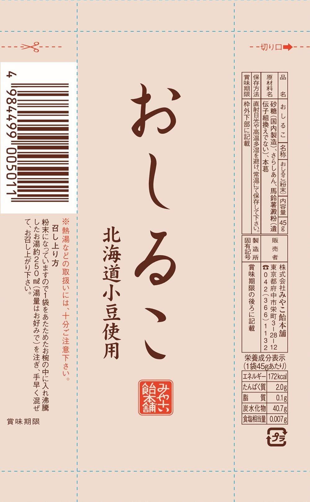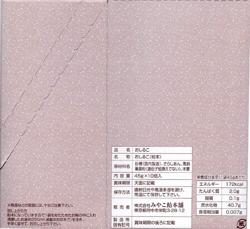 「『みやこ飴本舗 おしるこ』は、心温まる伝統的な和スイーツを手軽に楽しむことができる一品です!45gのパッケージが10本セットとなっており、どこでもおいしいおしるこを味わえます。」