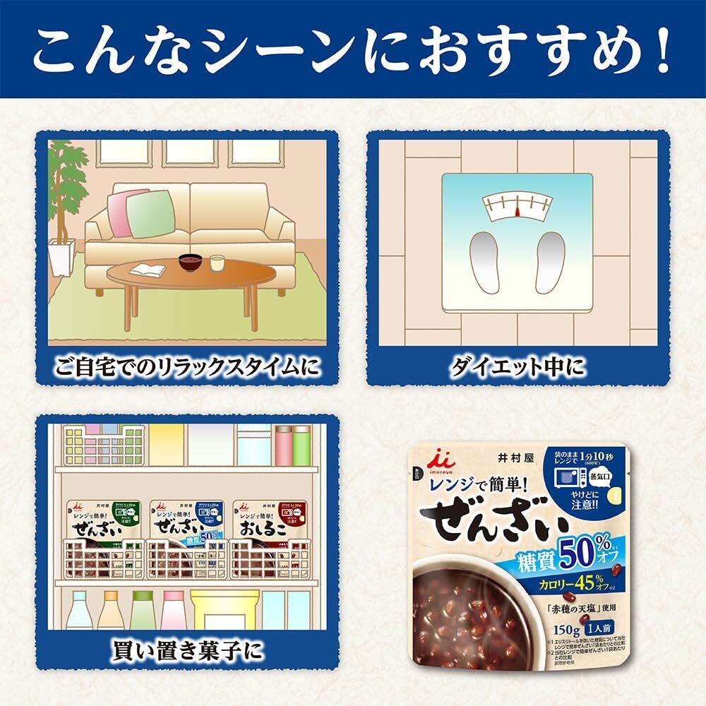 「『レンジで簡単糖質50%オフぜんざい』は、カロリーを気にする方でも安心して楽しめる、糖質50%オフのぜんざいです!150gのパウチが10個入っており、手軽に美味しさを味わえます。」
