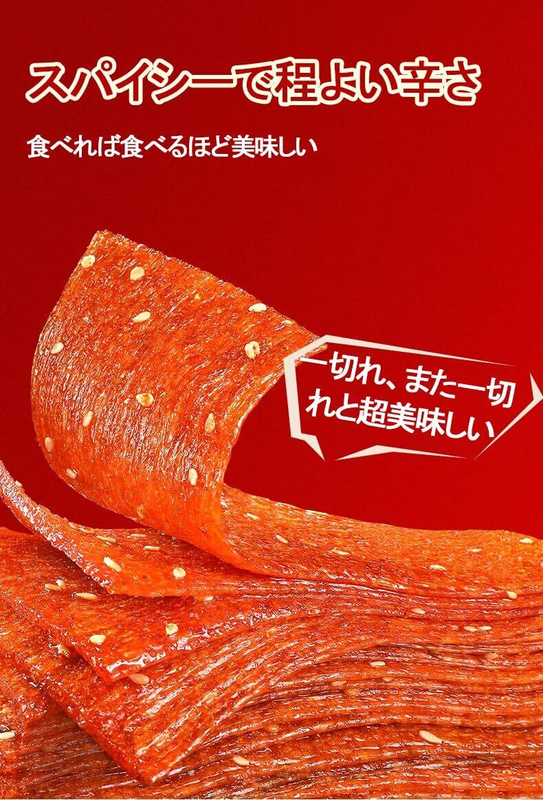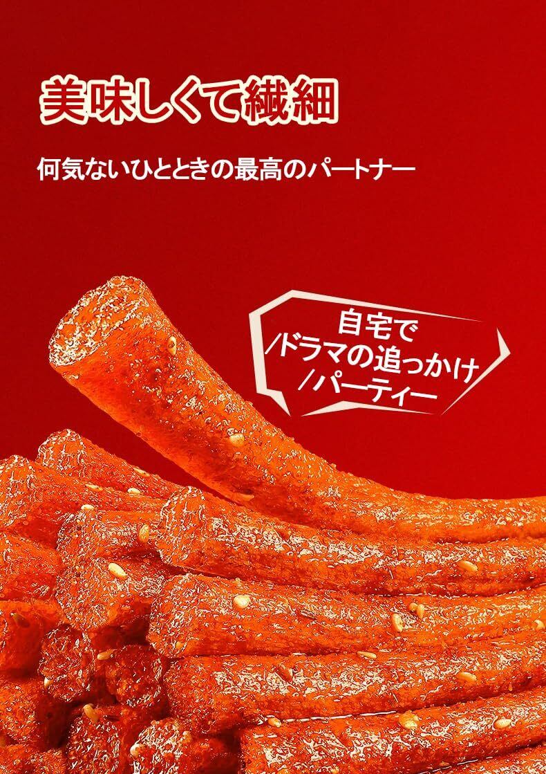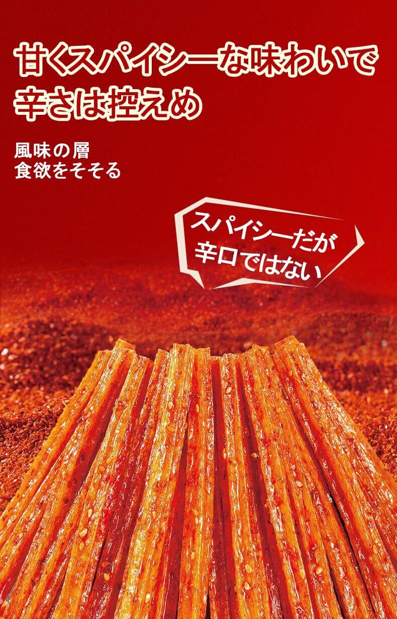 「『ラーティアオソフト』は、スパイシーで噛み応えのある中国のお菓子です!独自の製法で仕上げたこのおつまみは、刺激的な風味が口の中で広がり、あなたを虜にします。」