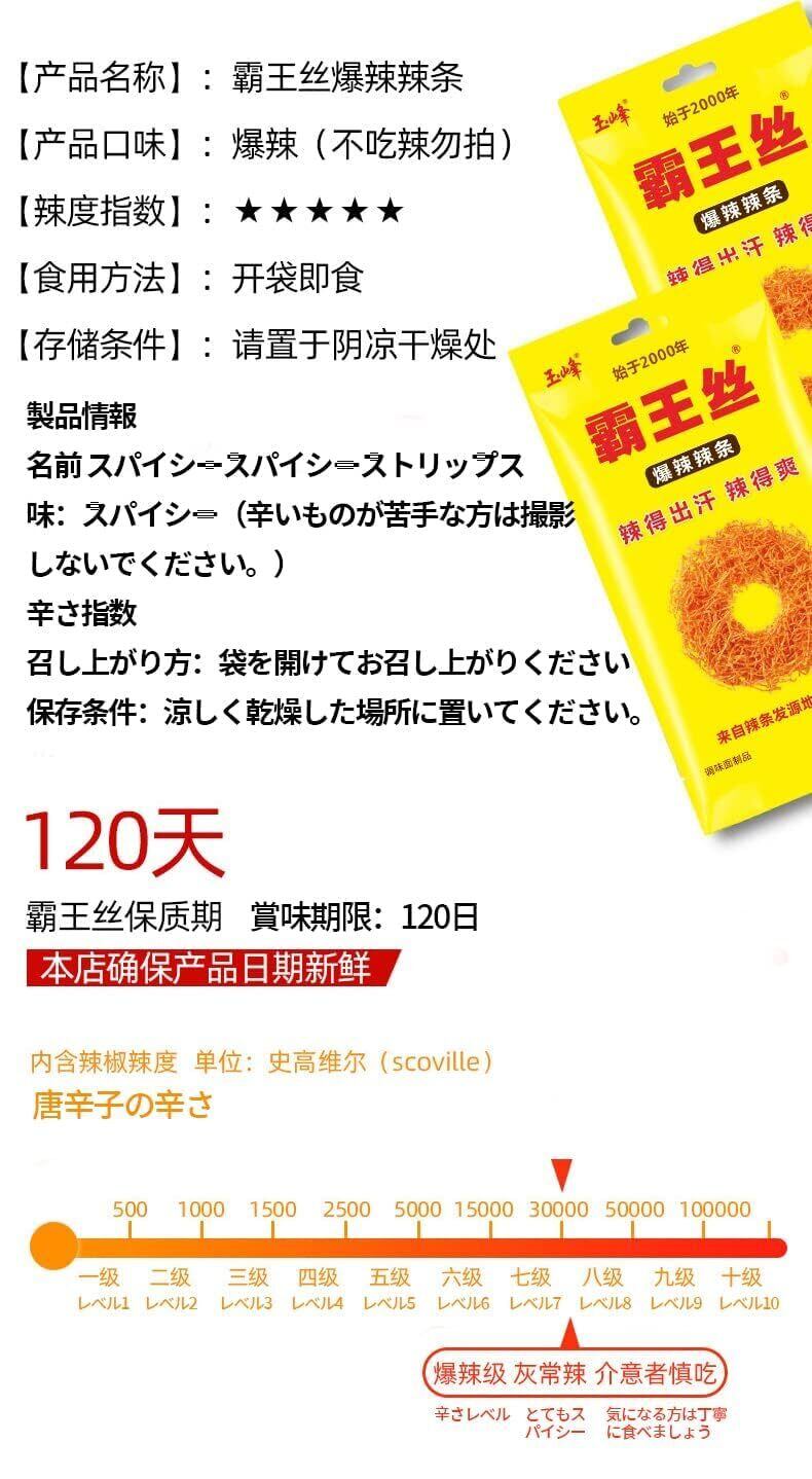 「『辣条 霸王丝』は、中国湖南省の特産品として人気のあるエクストラスパイシーなお菓子です!独自の製法で作られたこのスナックは、ピリッとした辛さと香ばしい風味が絶妙に絡み合い、食べる手が止まりません。」