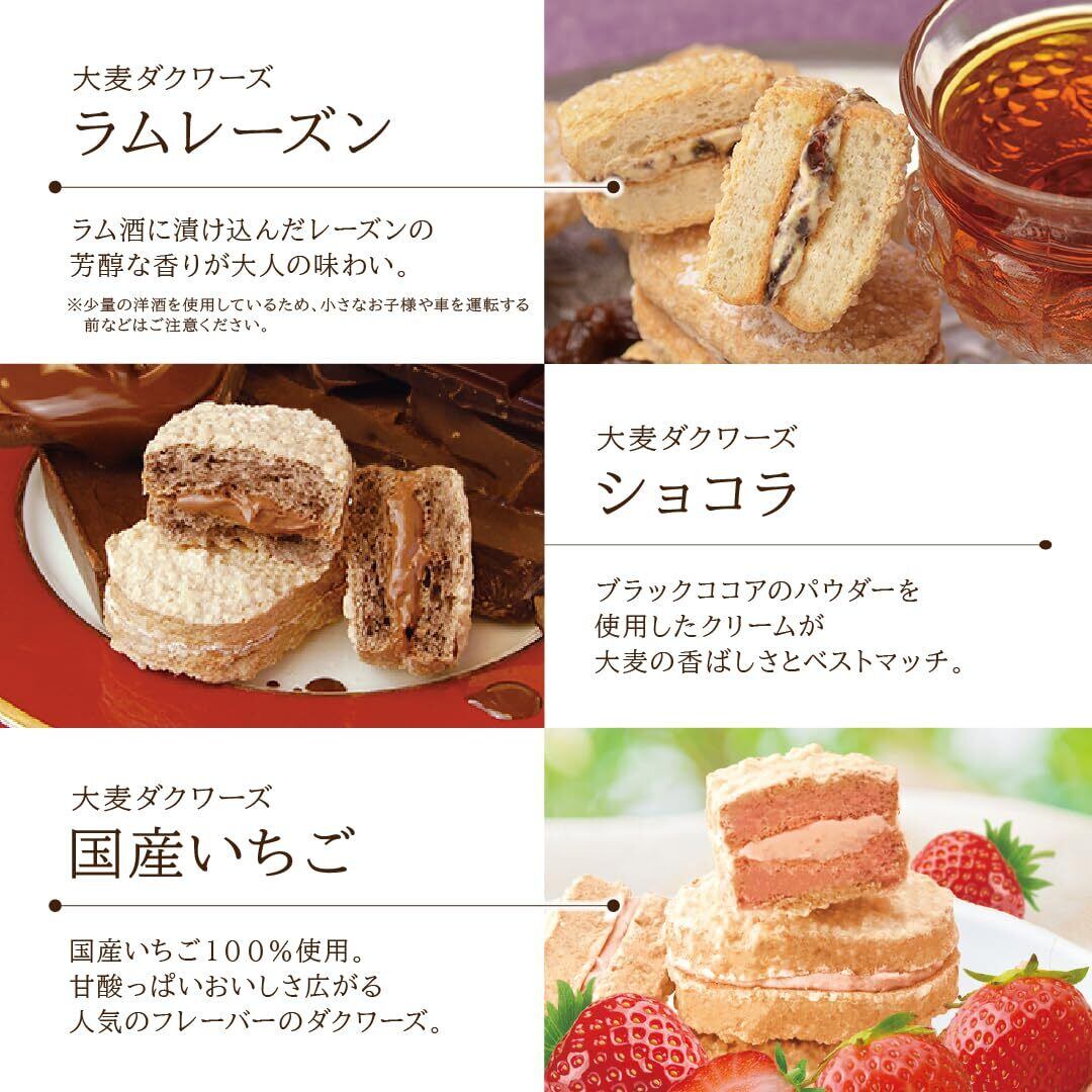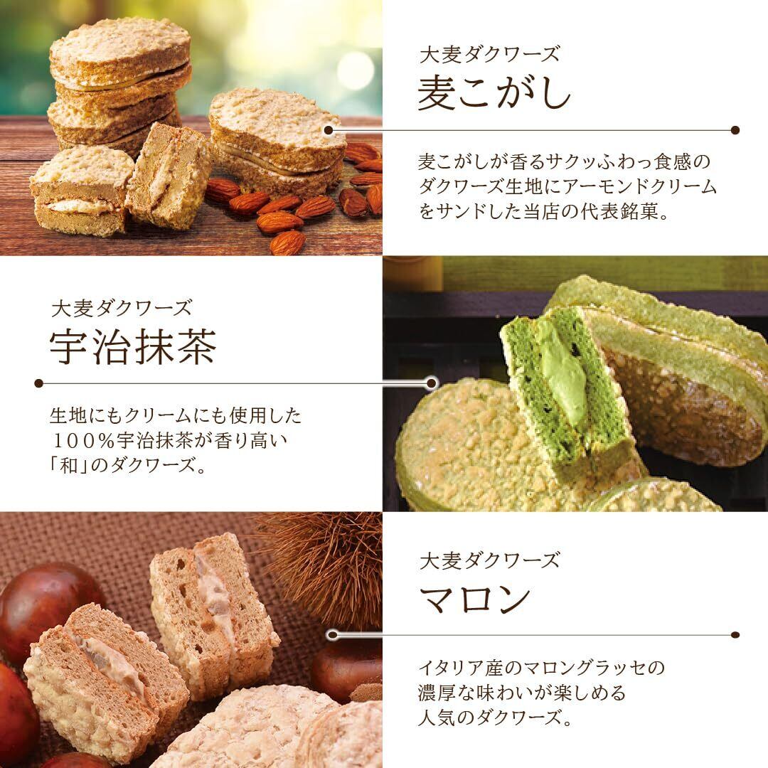 「『おおむぎ工房 大麦 ダクワーズ A』は、国産大麦100%使用のヘルシーな焼き菓子です!全6種類、18個入りで、特別な時間を彩るスイーツとして非常におすすめです。」