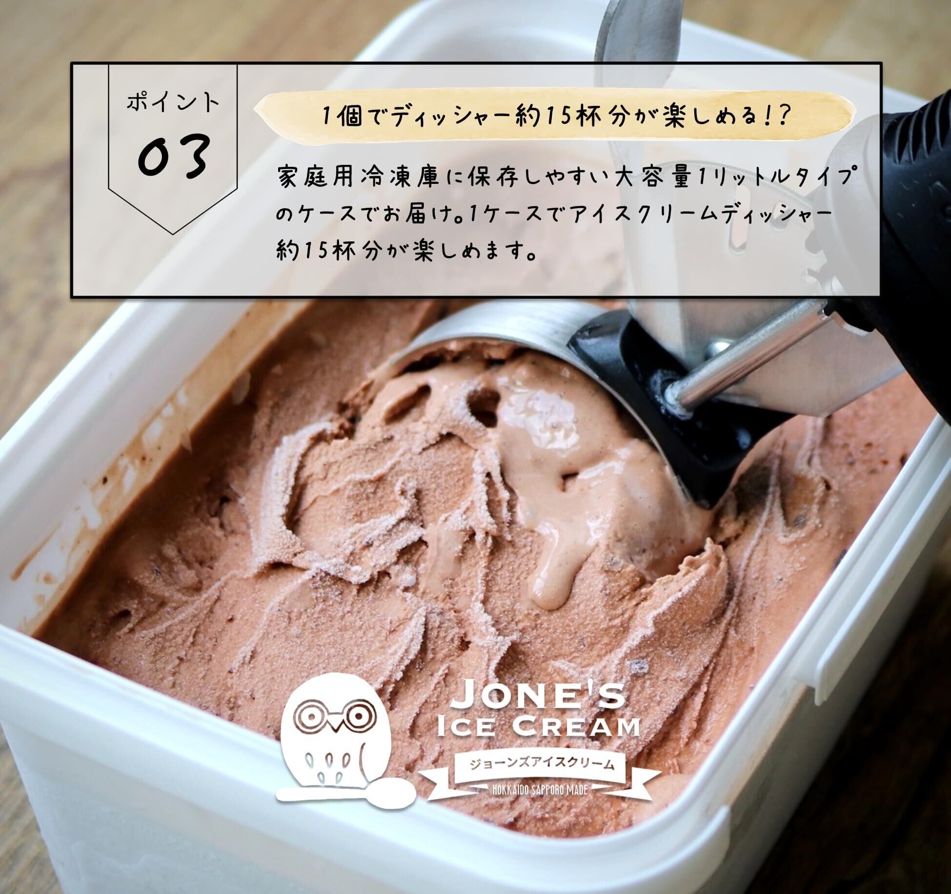 「北海道の新鮮な生乳を贅沢に使用し、濃厚なチョコレートの旨味を引き立てています。丁寧に製造されたアイスクリームは、口の中でとろけるような滑らかさがあり、深いコクを感じていただけます。特別な日のデザートや、子供たちのおやつにぴったりです!」