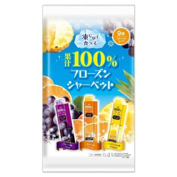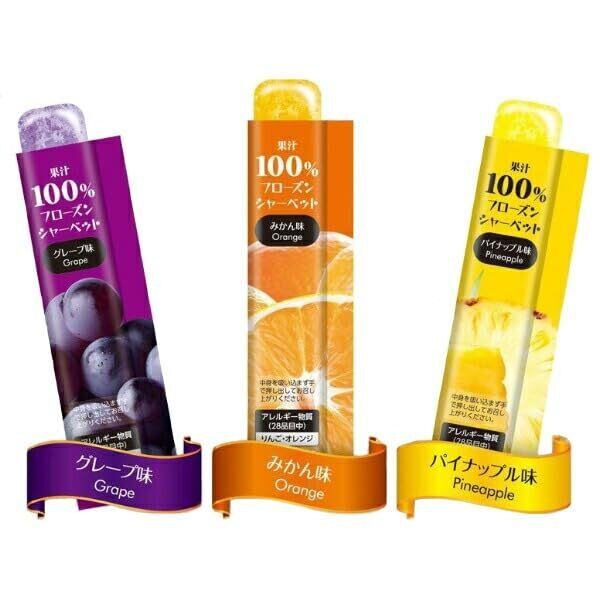 ■凍らせて食べるハンディシャーベット 暑い日に凍らせて手軽にシャリっとお召し上がりいただける スティックタイプのシャーベットです。 ■濃厚でおいしい果汁100% ジューシーで果汁感あふれる濃厚な味わいをお楽しみいただけます。 ■おいしさ選べる3種アソート グレープ味、みかん味、パイナップル味は暑い日にぴったりな定番フレーバーです。 どれを選んでもおいしい飽きの来ないアソートです。