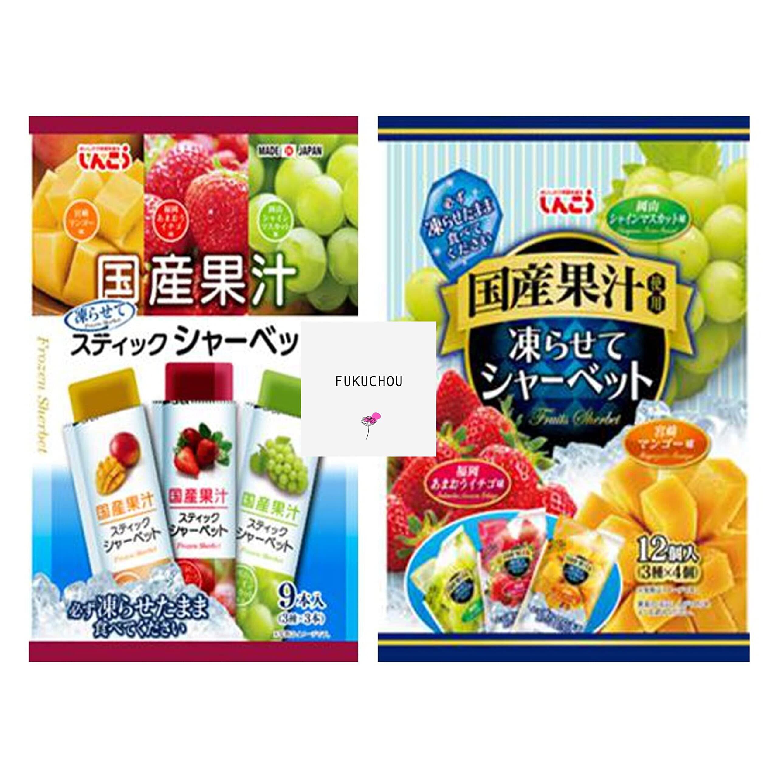 《国産果汁 凍らせてシャーベット》小さく小分けされたパウチタイプのシャーベットです。岡山シャインマスカット味、福岡あまおうイチゴ味、宮崎マンゴー味の3種類。国産果汁を使った本格的なシャーベットを楽しめます。 《国産果汁 スティックシャーベット》細くても食べ応えのあるスティックタイプのシャーベットです。岡山シャインマスカット味、福岡あまおうイチゴ味、宮崎マンゴー味の3種類。国産果汁を使った本格的なシャーベットを楽しめます。【RICNHA オリジナルセット梱包】FUKUCHO