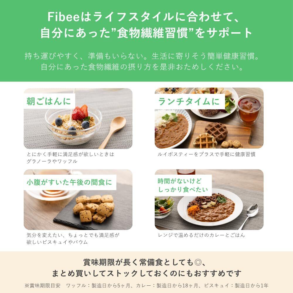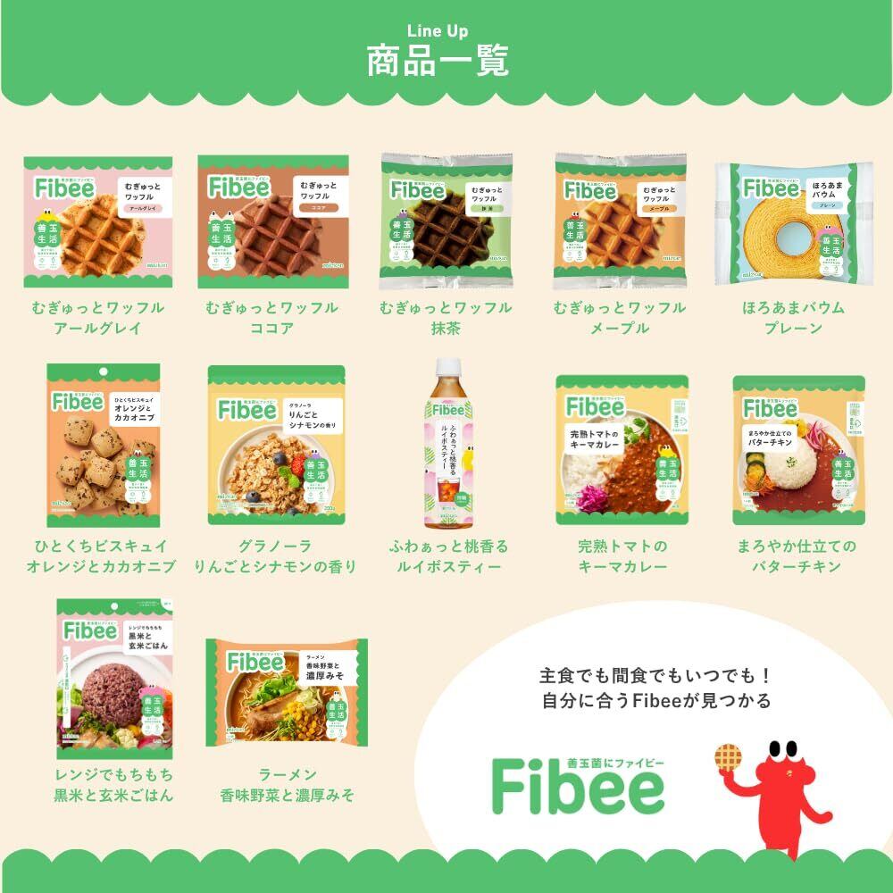 おからや全粒粉を使ってしっとり焼き上げた、むぎゅっと食感のワッフルです。やさしいココア味で、甘さひかえめに仕上げました。おからベースの生地なので腹持ちがよく、小腹満たしにぴったりです。Fibeeは、善玉菌にうれしい発酵性食物繊維がキーポイントの商品です。発酵性食物繊維とは、腸に届いて発酵する食物繊維です。食べると体の中から健康をサポートします。