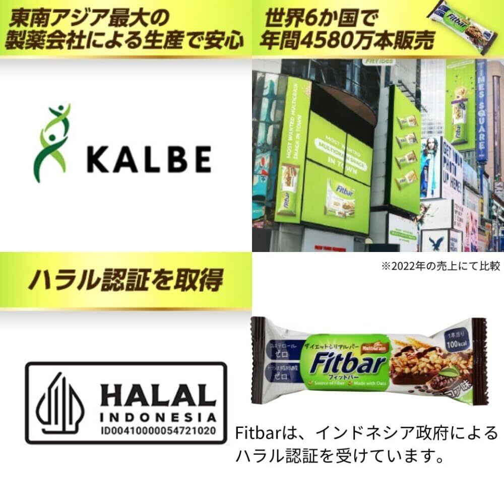 プロテインが通常の2倍配合されたFitbarが新登場 1本あたり120Kcal、コレステロールゼロ、トランス脂肪酸ゼロ 1本25gと食べ応え抜群 HALAL認証のシリアルバー プロテインが通常の2倍配合されたココア味のFitbar ※Fitbarココア味の2倍