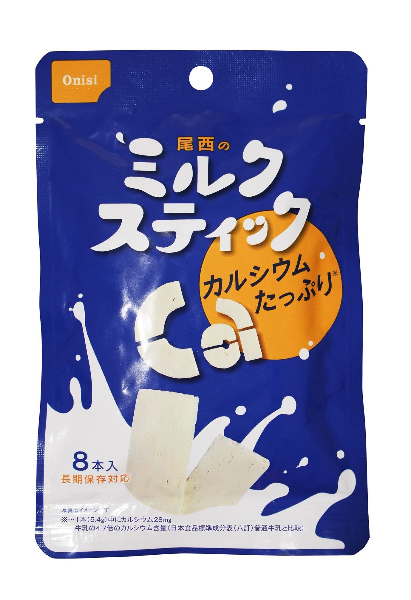1袋8本入りで高い栄養価(1本あたり23kcal)を手軽に摂れる新しいタイプの長期保存食です。非常時はイライラしがち、そんな時口にするだけでホッと安心する甘さ控えめ、優しい味の国産生乳から作ったミルクスティックです。一枚一枚個包装になっているので衛生的で配布にも便利です。