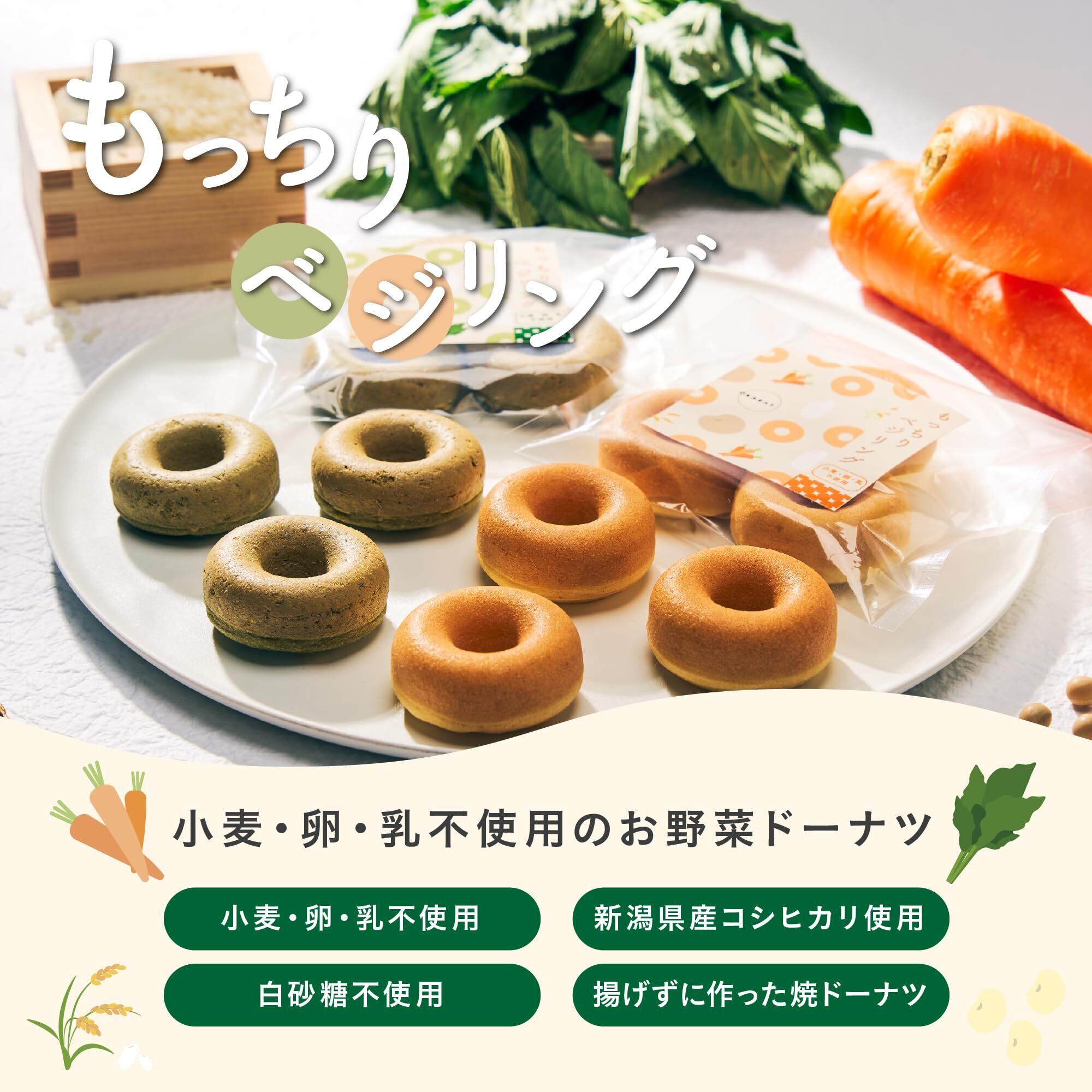 【自然派ヘルシー志向の方におすすめ!】 新潟県産コシヒカリの米粉と国産大豆のおからを使用した、グルテンフリーの焼きドーナツです。 油で揚げていないため、ヘルシーなのが特徴。にんじんやモロヘイヤなどの野菜パウダーを使用しており、自然な甘さと風味が楽しめます。健康を意識している方や、グルテンを控えている方にもおすすめです。