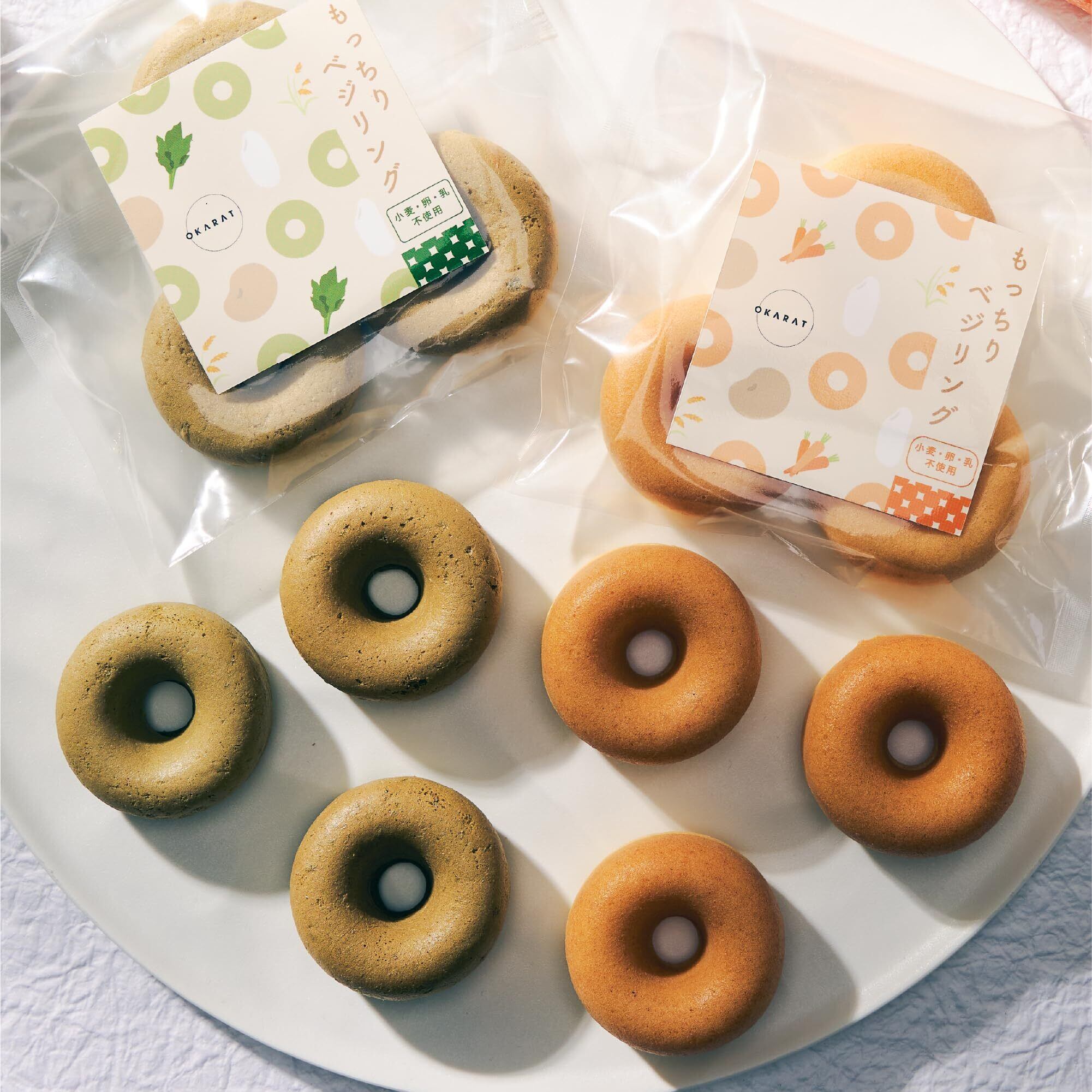 「『OKARAT もっちりベジリング 10袋入り』は、低脂質・低糖質にこだわったノンフライのおからドーナツです!グルテンフリーで、小麦や白砂糖を使用せず、アルミフリーの安心素材を厳選。ダイエット中の方でも安心して楽しめます!」