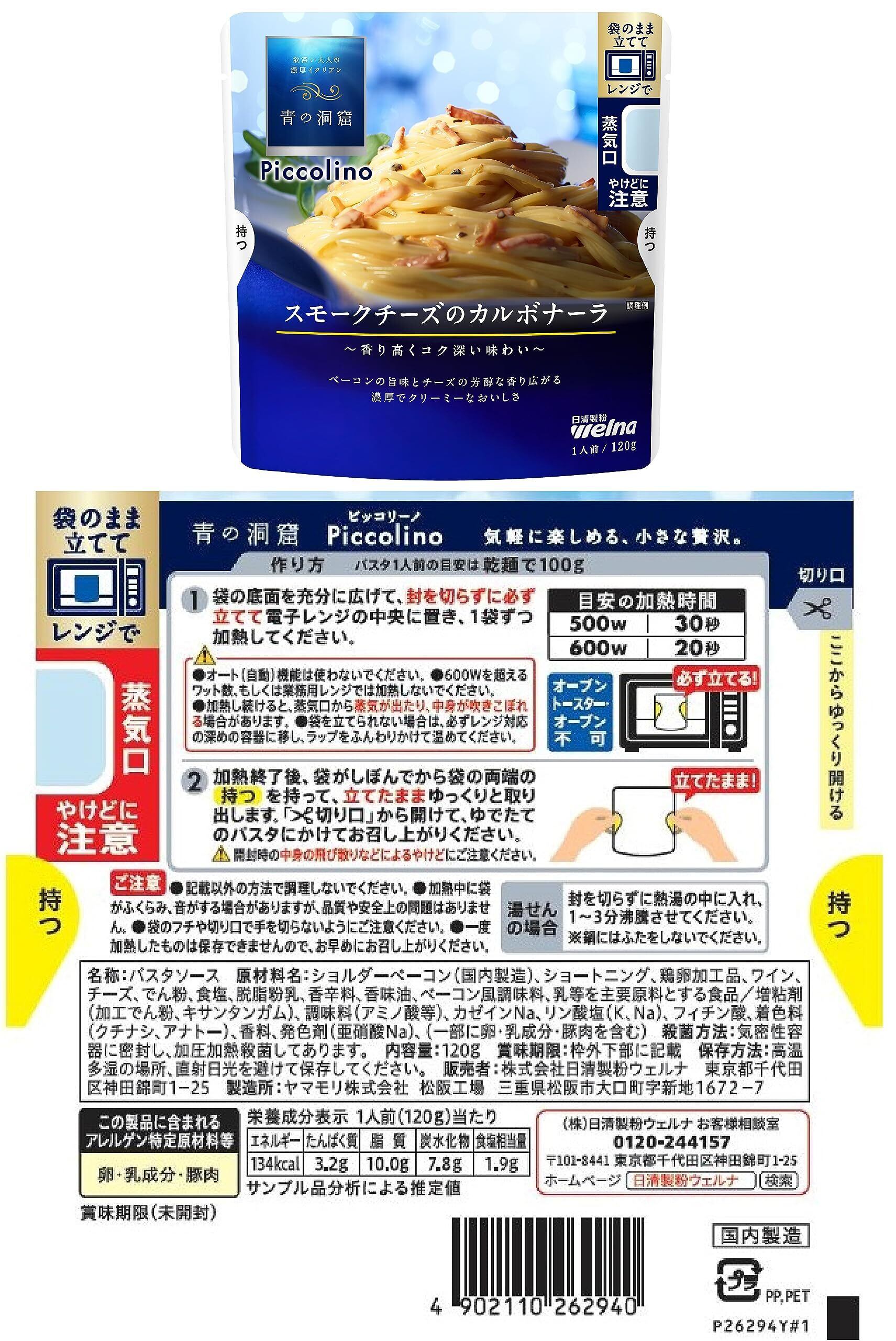 【クリーミーボロネーゼ】:トマトペースト、牛肉、たまねぎ、豚肉、乳等を主要原料とする食品、植物油脂、砂糖、にんじん、食塩、きのこペースト、にんにく、バター、ワイン、ブロード、ポークエキス、香辛料、酵母エキス粉末/増粘剤(加工でん粉)、調味料(アミノ酸等)、着色料(カラメル)、乳化剤、酸味料、(一部に乳成分・牛肉・大豆・鶏肉・豚肉を含む)【マスカルポーネのポモドーロ】:トマト・ジュースづけ(イタリア製造)、たまねぎ、トマトペースト、植物油脂、チーズ、砂糖調整品、食塩、にんにくペースト、でん粉、香辛料、乳等を主要原料とする食品/増粘剤(加工でん粉)、乳化剤、調味料(アミノ酸等)、リン酸K、カゼインNa、(一部に乳成分・大豆を含む)【あさりと帆立のラグー】:あさり(中国)、たまねぎ、植物油脂、ワイン、にんにくペースト、食塩、でん粉、オリーブ加工品、ほたて、魚介エキス、あさりエキス、香辛料/増粘剤(加工でん粉)、調味料(アミノ酸等)、乳化剤、香料、(一部にかに・小麦・大豆・鶏肉を含む)【ポルチーニ香るきのこクリーム】:エリンギ(国産)、たまねぎ、ショートニング、生クリーム、でん粉、バター、食塩、チーズ、砂糖調整品、脱脂粉乳、乳等を主要原料とする食品、ソテーマッシュルームソース、にんにくペースト、ブランデー、ポルチーニエキス、ポークエキス、マュシュルームエキスパウダー、香辛料、しいたけエキス粉末/増粘剤(加工でん粉、キサンタンガム)、調味料(アミノ酸等)、カゼインNa、リン酸K、着色料(カラメル)、フィチン酸、乳化剤、香料、(一部に小麦・乳成分・大豆・豚肉を含む)【イカスミのソース】:植物油脂(スペイン製造、国内製造)、トマトペースト、ワイン、たまねぎ、でん粉、いか、食塩、にんにくペースト、砂糖、オニオンペースト、イカスミ加工品、いか発酵調味料、ローストガーリック、ブロード、魚介エキス、香辛料/増粘剤(加工でん粉)、調味料(アミノ酸等)、酸味料、香料、(一部に小麦・いか・大豆・鶏肉を含む【海老のトマトクリーム】:トマトペースト(ポルトガル製造、中国製造)、生クリーム、アメリケーヌソース、ショートニング、還元水あめ、えび、植物油脂、乳等を主要原料とする食品、食塩、おきあみエキス、ミルポワ、ラード、砂糖、脱脂粉乳、でん粉、にんにくペースト、バター、調味えび粉末、酵母エキス粉末、魚介エキス、香辛料/増粘剤(加工でん粉、キサンタンガム)、調味料(アミノ酸等)、カゼインNa、乳化剤、リン酸K、PH調整剤、着色料(パプリカ色素)、(一部にえび・かに・小麦・乳成分・大豆・鶏肉・ゼラチンを含む)【スモークチーズのカルボナーラ】:ショルダーベーコン(国内製造)、ショートニング、鶏卵加工品、ワイン、チーズ、でん粉、食塩、脱脂粉乳、香辛料、香味油、ベーコン風調味料、乳等を主要原料とする食品/増粘剤(加工でん粉、キサンタンガム)、調味料(アミノ酸等)、カゼインNa、リン酸塩(K、Na)、フィチン酸、着色料(クチナシ、アナトー)、香料、発色剤(亜硝酸Na)、(一部に卵・乳成分・豚肉を含む)