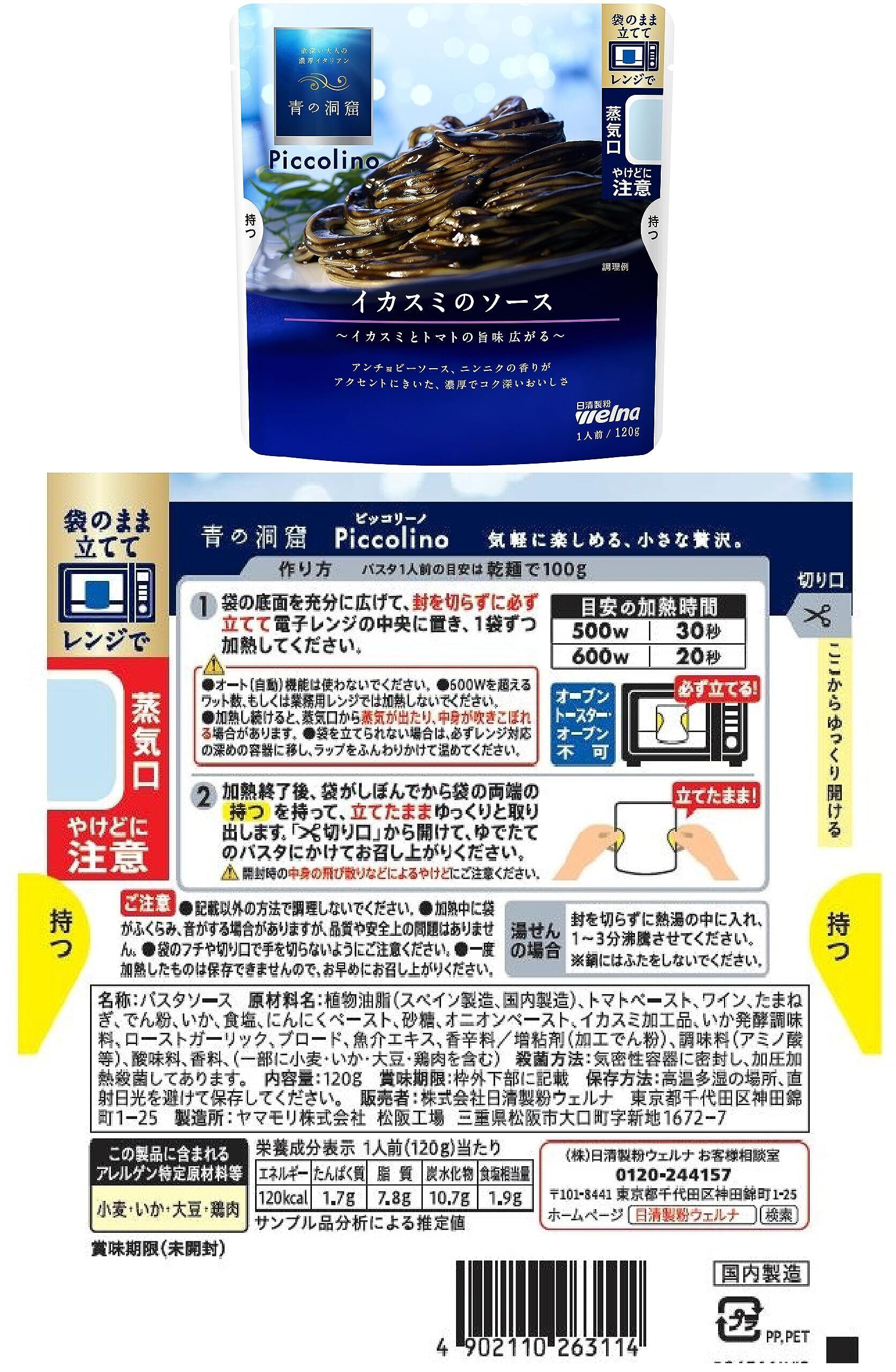 【イカスミのソース】:イカスミとトマトの旨味広がるアンチョビーソース、ニンニクの香りがアクセントにきいた、濃厚でコク深いおいしさ。青の洞窟ならではの“贅沢なおいしさ”はそのままに、電子レンジ調理可能に。
