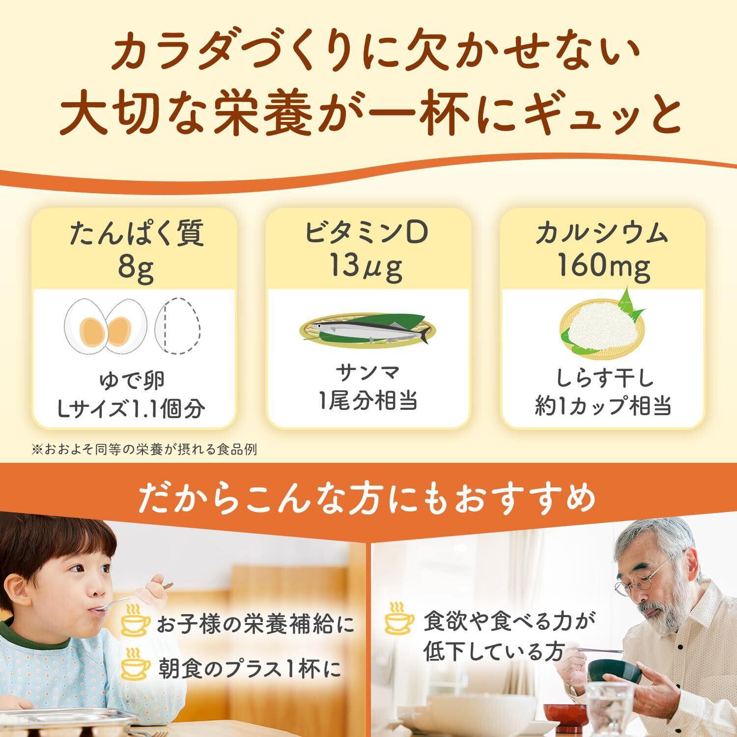 「高たんぱく質を追求したスープは、ダイエット中の方や、運動後の栄養補給にも最適です。ビタミンDとカルシウムも豊富で、健康的な生活をサポートします!」