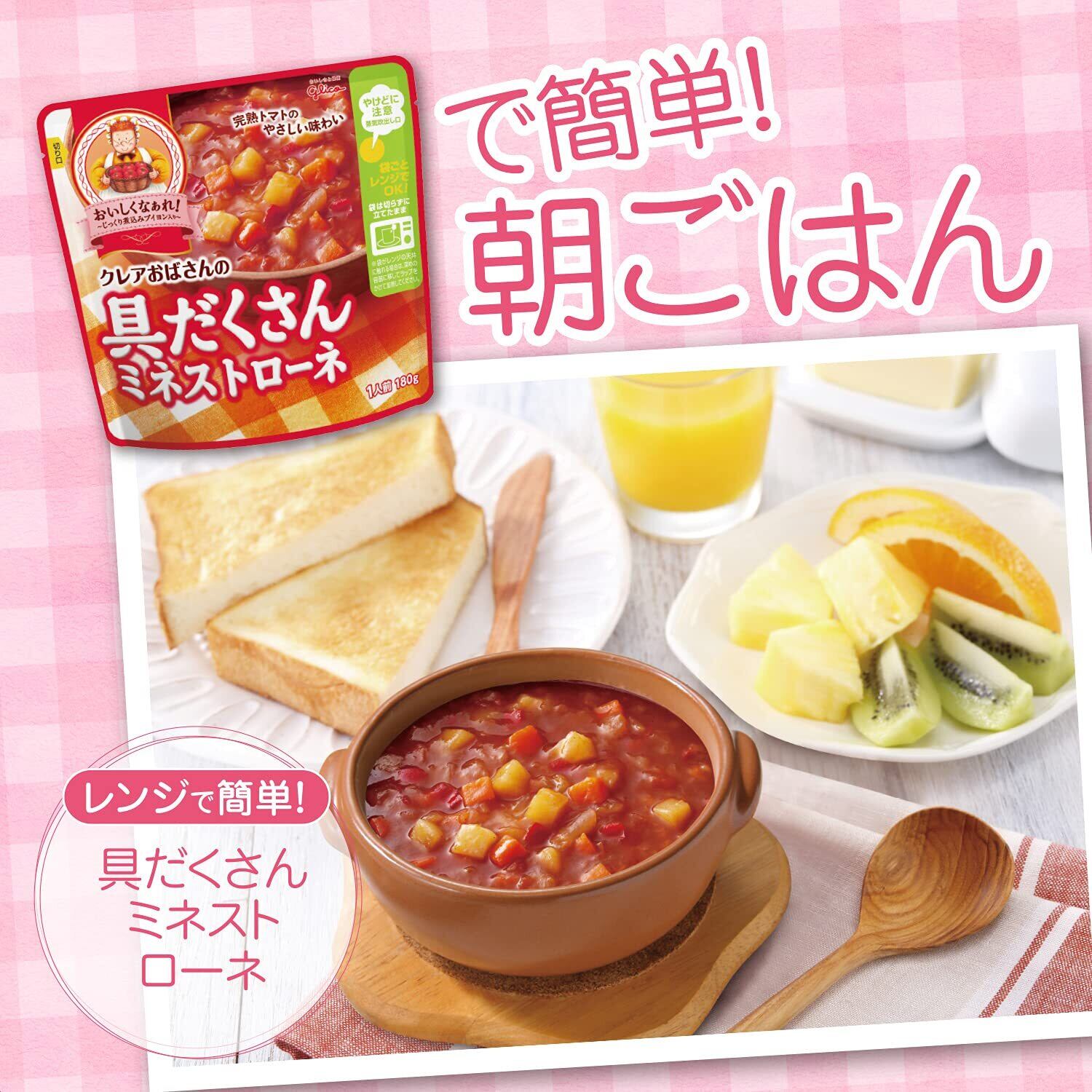 「『クレアおばさんの具だくさんミネストローネ 180g×5個』は、しっかりとした具材とトマトの旨みが詰まったミネストローネです。バランスの取れた味わいで、忙しい日々の中でも手軽に温かいスープを楽しむことができます。」