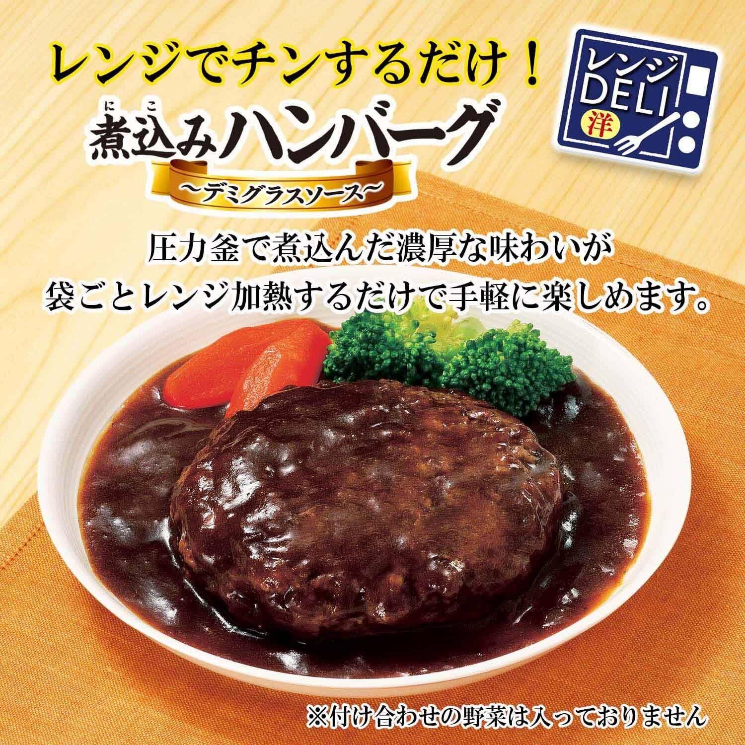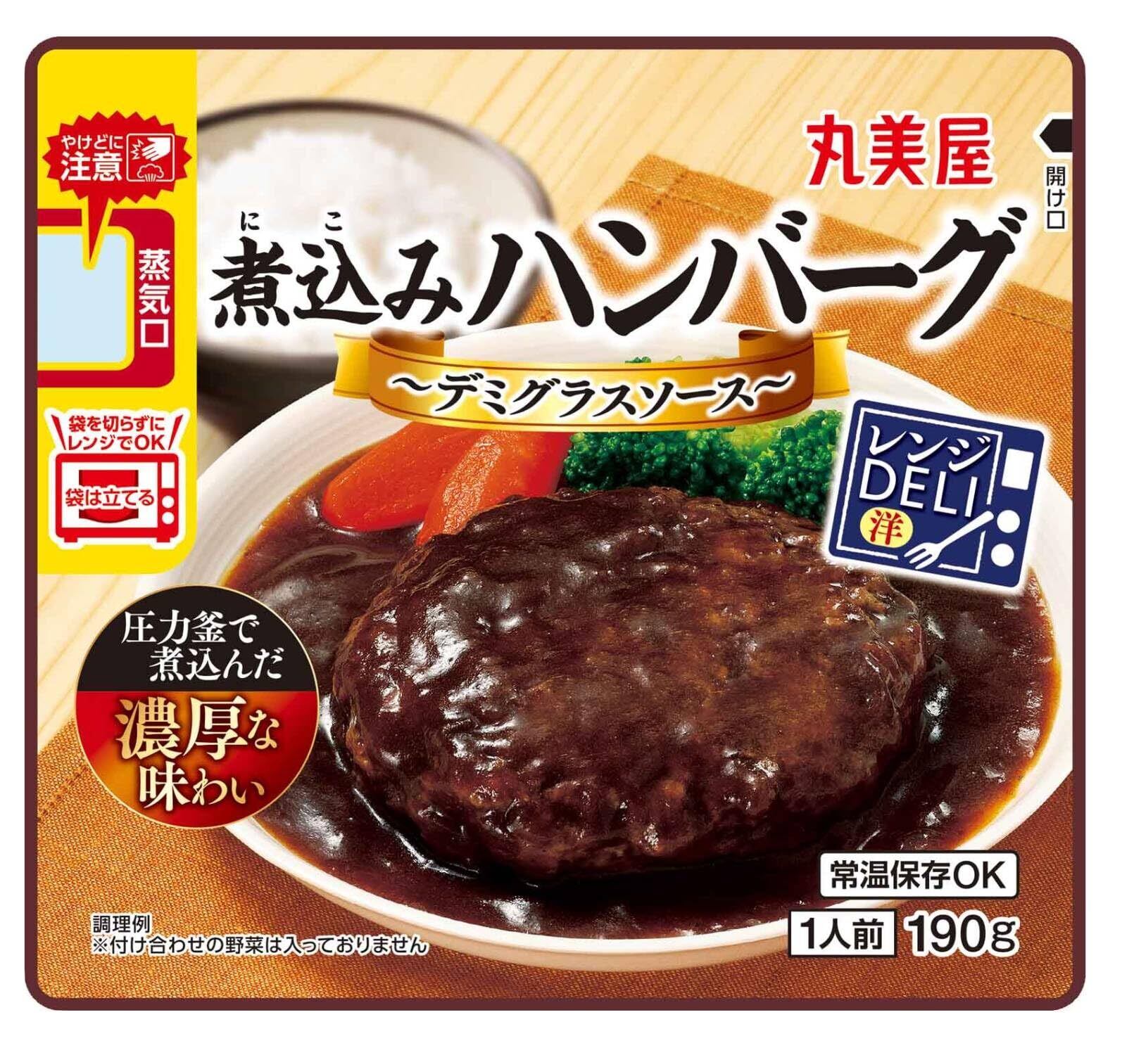 「『丸美屋 レンジDELI 煮込みハンバーグ デミグラスソース』は、肉汁溢れるジューシーなハンバーグに、濃厚なデミグラスソースで仕上げた一品です。190gの使いやすいサイズが5個セットになっており、忙しい日々でも手軽に洋食を楽しむことができます。」