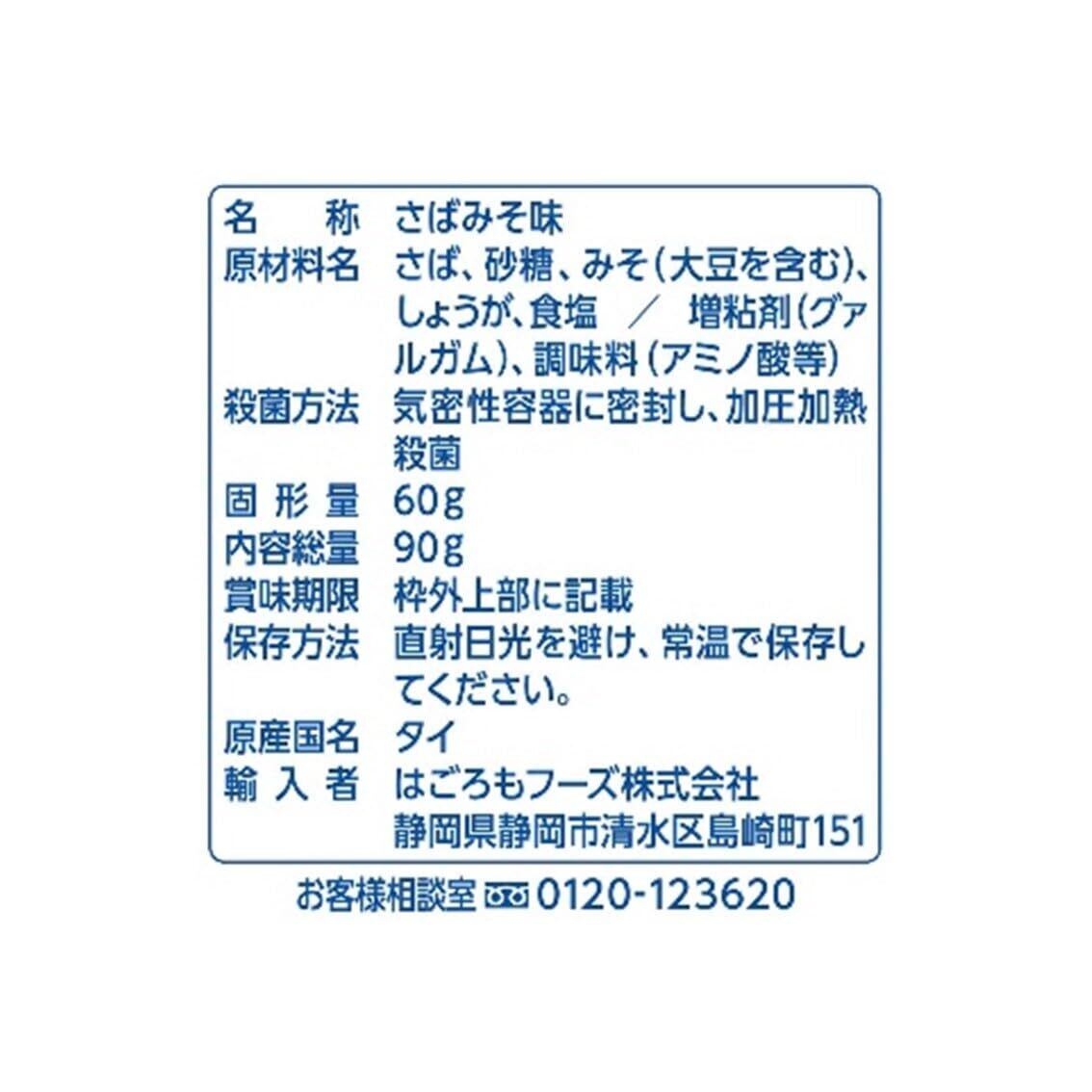原材料:さば、砂糖、みそ(大豆を含む:遺伝子組換えでない)、しょうが / 増粘剤(グァルガム)、調味料(アミノ酸等)