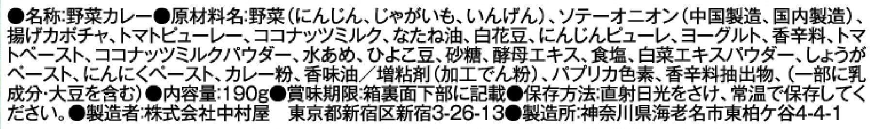 野菜(にんじん、じゃがいも、いんげん)、ソテーオニオン(中国製造、国内製造)、揚げカボチャ、トマトピューレー、ココナッツミルク、なたね油、白花豆、にんじんピューレ、ヨーグルト、香辛料、トマトペースト、ココナッツミルクパウダー、水あめ、ひよこ豆、砂糖、酵母エキス、食 塩、白菜エキスパウダー、しょうがペースト、にんにくペースト、カレー粉、香味油/増粘剤(加工でん粉)、パプリカ色素、香辛料抽出物、(一部に乳成分・大豆を含む)