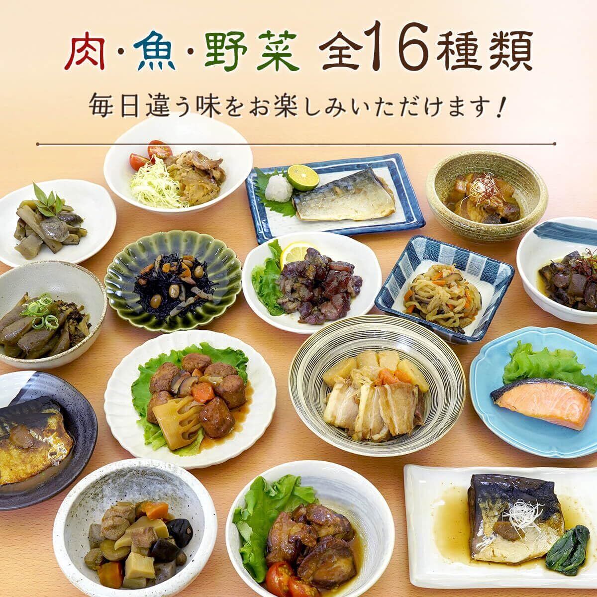 - 肉、魚、野菜の16種類のおかずが楽しめる!