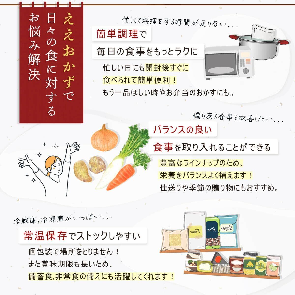 ええおかず は 余分な 調味料 は一切使用せず 食材 本来の味を存分に生かし、 まるで 作り立てのような味わいの美味しさをお召し上がりいただけます。 ええもん広場 オリジナル 和風 レトルト惣菜 詰め合わせセット