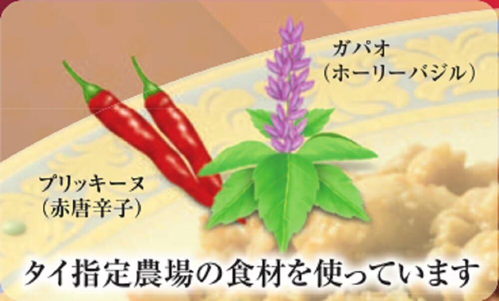 ●ナンプラーの旨みとにんにく、甘味を強め、具材は鶏肉、ガパオ、唐辛子の量を増やし、よりタイ現地の味に近づけました。
