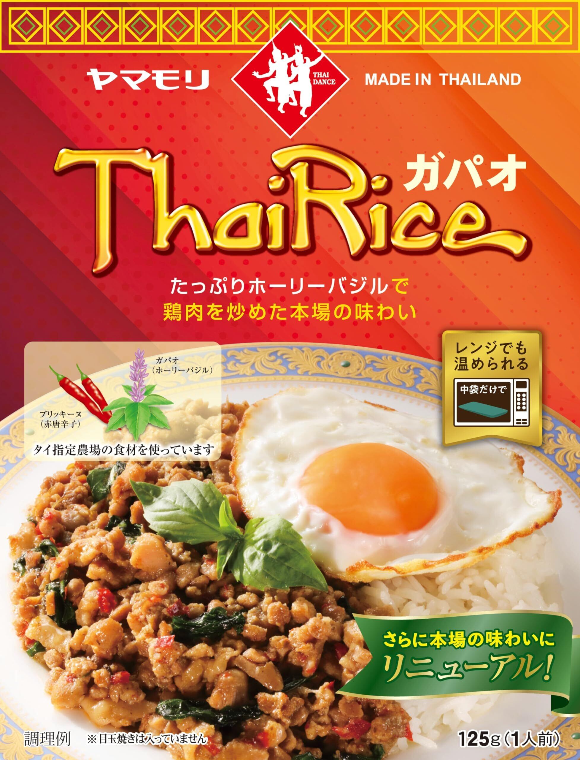 「『ヤマモリ ガパオライス』は、香ばしいバジルと鶏ひき肉が絶妙に絡み合った、本格的なタイ料理の味わいを楽しめるレトルトパウチです。125gの使いやすいサイズが5個セットになっており、忙しい日々の中でも手軽にエスニックな食卓を楽しむことができます。」