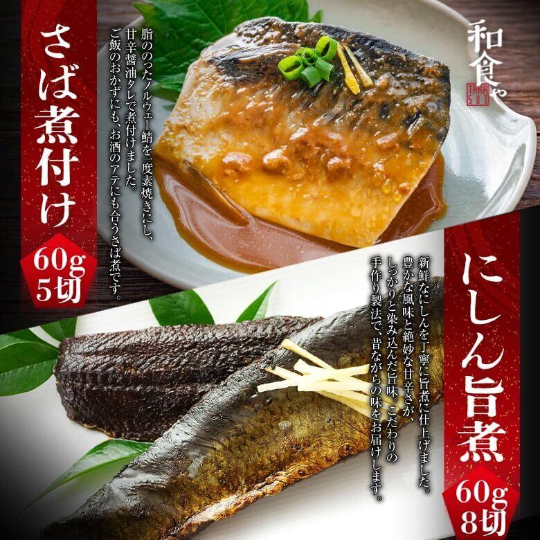 【内容量】7種13食 さば醤油煮レトルト60g2切、にしん醤油レトルト60g4切、さばの塩焼きレトルト60g2切、シャケの塩焼きレトルト60g2切、鯛かぶと煮レトルト180g1個、にしん塩焼きレトルト60g4切、ほっけ塩焼きレトルト60g4切