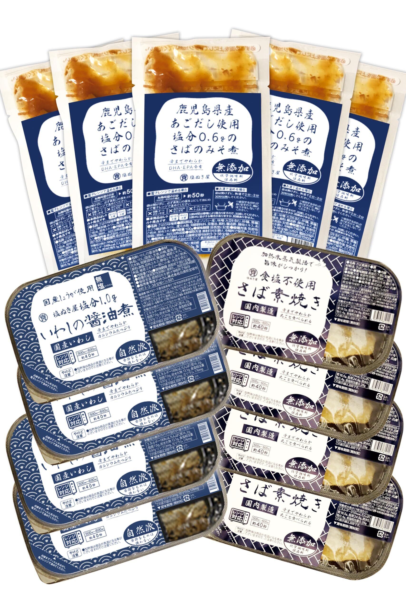 塩ぬき屋 減塩 無添加 お魚料理3種 計13セット(さば味噌煮5点・さば素焼き4点・いわし醤油煮4点) / 常温保存 長期保存 美味しい おかず 惣菜 レトルト 防災食 保存食 惣菜 国産 詰め合わせ 煮魚 焼き魚
