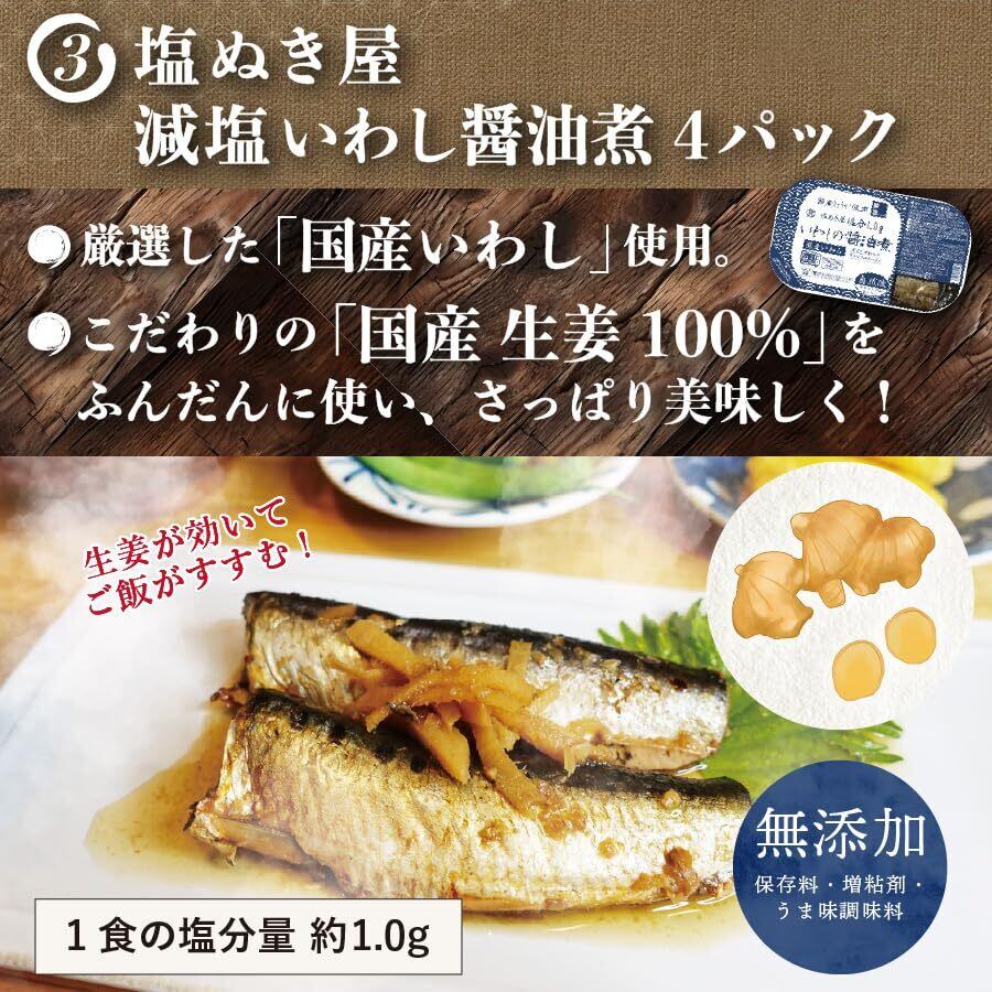 【いわし醤油煮】 :いわし(国産)、生姜、砂糖、醤油、還元水飴、発酵調味料、醸造酢、鰹節エキス、澱粉、食塩、昆布エキス、酵母エキス、あご粉末、魚醤、椎茸エキス、(一部に小麦・大豆を含む)
