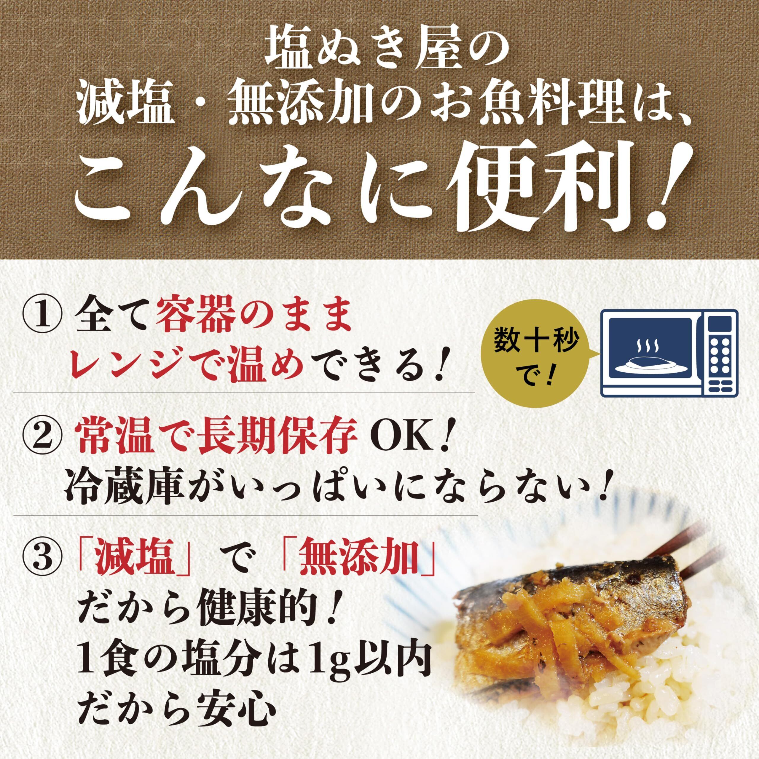 日常のお食事にお魚は足りていますか? 本品は、無添加の「塩ぬき屋」ブランドで美味しいと大人気の減塩お魚惣菜3種(計13セット)です。 煮付けなど、調理が面倒なお魚料理が、このセットなら、容器のままレンジで数十秒、温めるだけで簡単、手軽にお召し上がり頂けます!