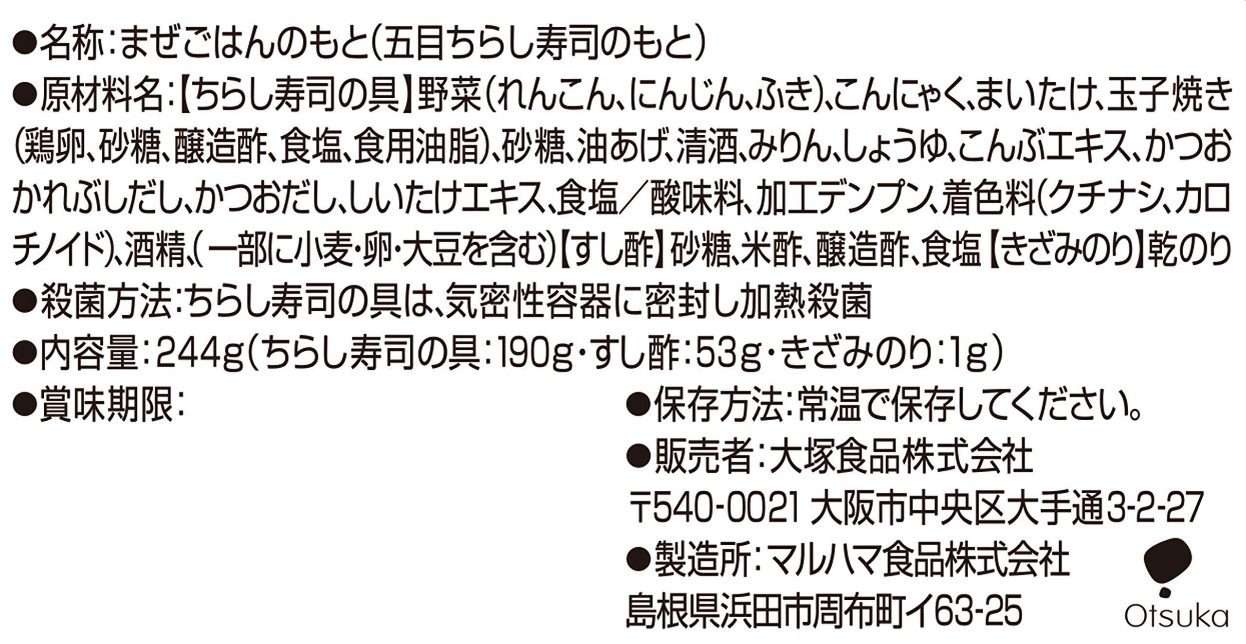原材料:【ちらし寿司の具】野菜(れんこん、にんじん、ふき)、こんにゃく、まいたけ、玉子焼き(鶏卵、砂糖、醸造酢、食塩、食用油脂)、砂糖、油あげ、清酒、みりん、しょうゆ、こんぶエキス、かつおかれぶしだし、かつおだし、しいたけエキス、食塩/酸味料、加工デンプン、着色料(クチナシ、カロチノイド)、酒精、(一部に小麦・卵・大豆を含む)【すし酢】砂糖、米酢、醸造酢、食塩【きざみのり】乾のり