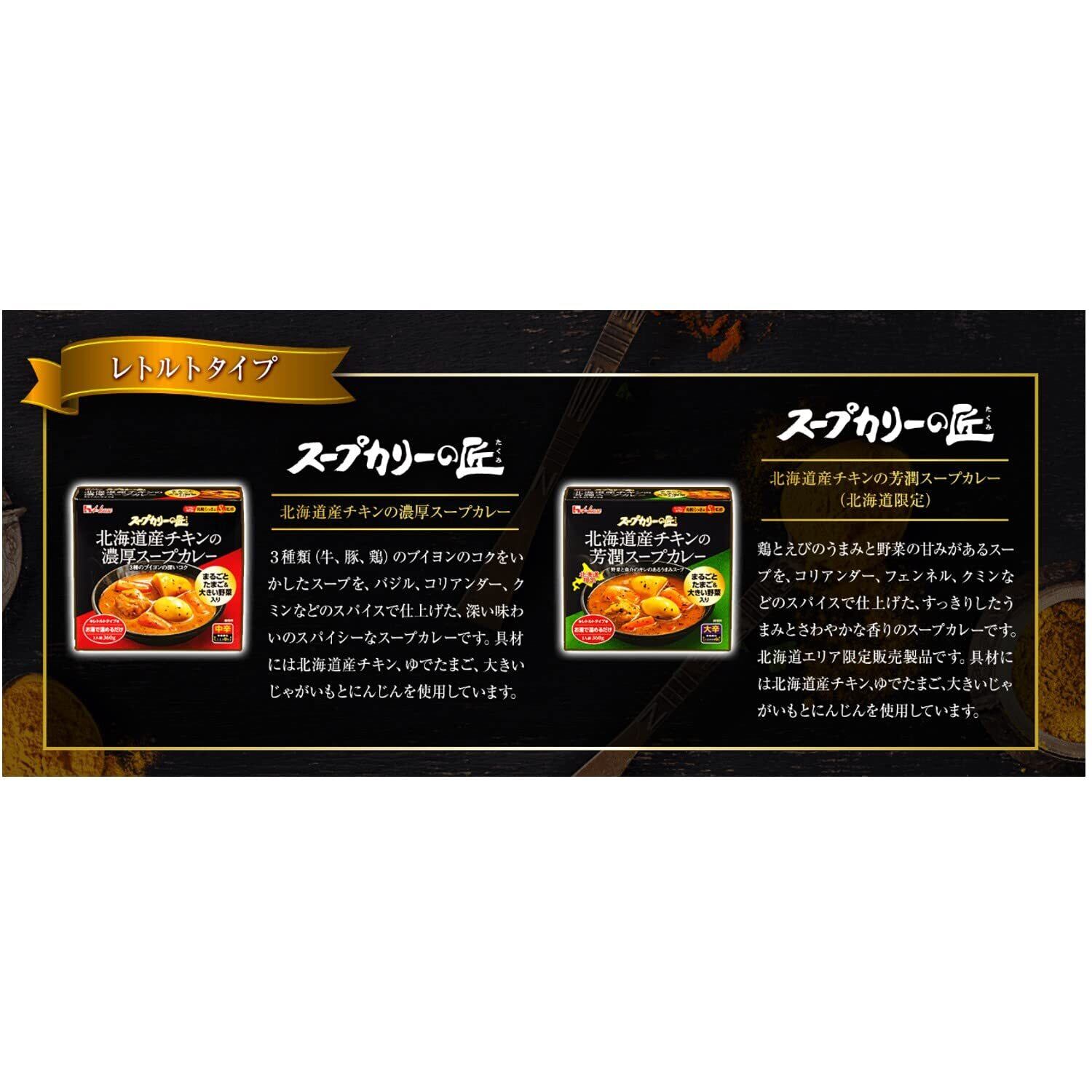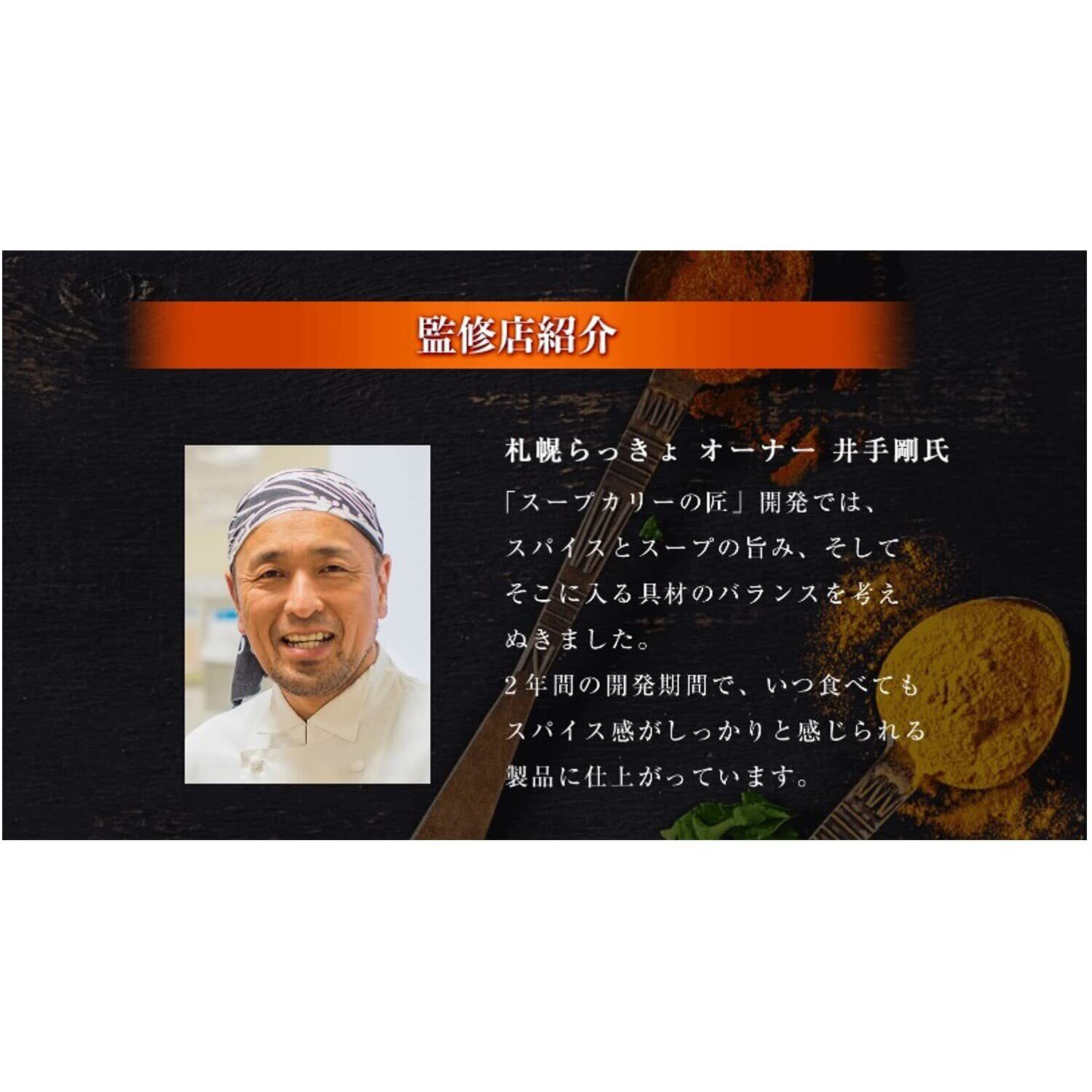 札幌スープカレー専門店「らっきょ」オーナー井手氏監修。 存在感ある大きさの具材に味のベースとなるスープの旨みとスパイスを焙煎したオイルの香りが特徴のレトルトタイプのスープカレー。 3種類(牛、豚、鶏)のブイヨンのコクをいかしたスープをバジル、コリアンダー、クミンなどのスパイスで仕上げた、深い味わいのスパイシーなスープカレーすこっく。 具材には北海道産チキン、ゆでたまご、大きいじゃがいもとにんじんを使用しています。 家庭で手軽に専門店のような本格的な味わいのスープカレーを楽しむことができます。