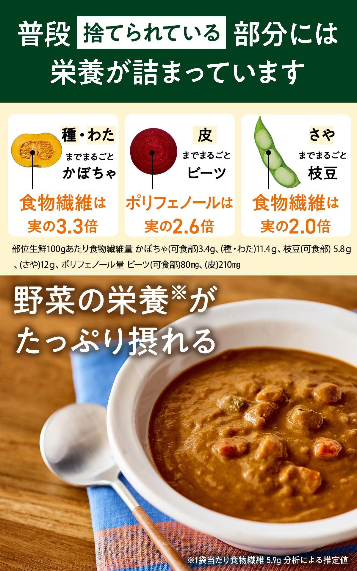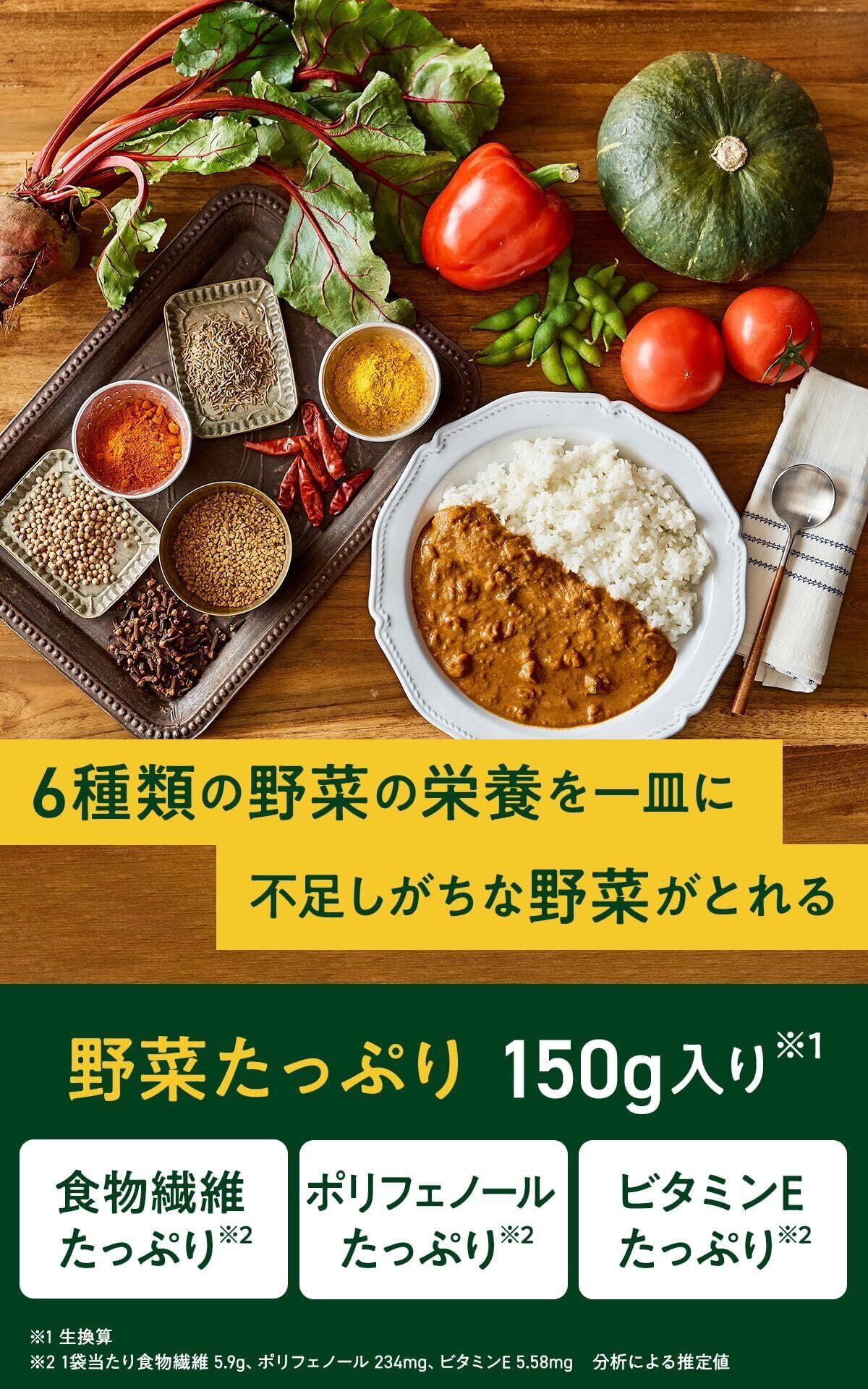 【栄養がとれる スパイスカレー】食物繊維・ポリフェノール・ビタミンEたっぷり※2。※2: 1袋あたり食物繊維5.9g、ポリフェノール234mg、ビタミンE 5.58mg、分析による推定値。