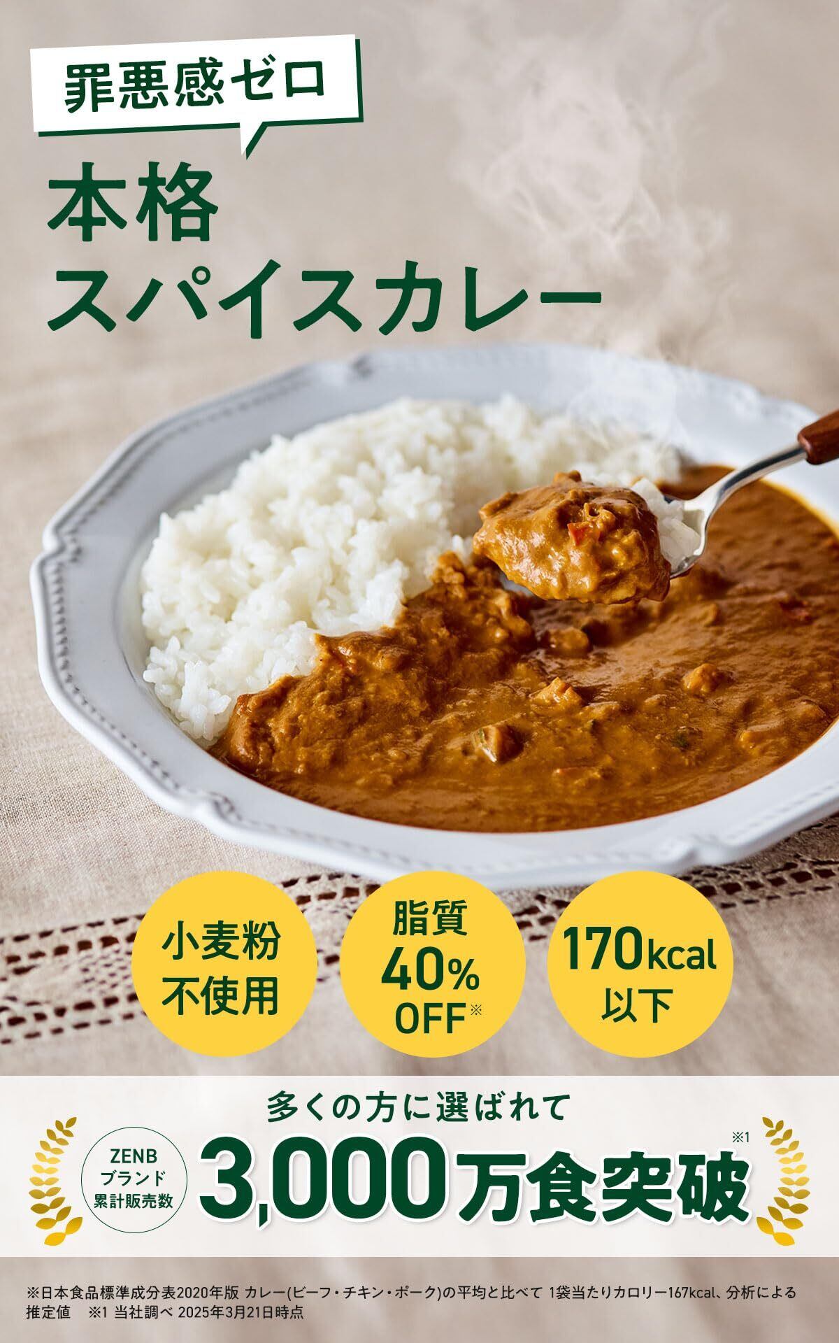 【野菜たっぷり スパイスカレー】累計販売数2000万食*1を突破した豆100%の麺、「ZENB ヌードル ( ゼンブヌードル )」が話題のZENBシリーズから、グルテンフリーのスパイスカレーがリニューアル。野菜たっぷり150g※2 1日に必要とされる野菜量の1/3がしっかり摂れます※3 。6種類の野菜の栄養をぎゅっと凝縮し、レンジ調理OKのレトルトなのに、不足しがちな野菜がとれる一皿に。普段食べられていない種・わたまでまるごとの「かぼちゃ」、さやまでまるごとの「枝豆」、皮までまるごとの「ビーツ」をぎゅっと凝縮した3種類のまるごと野菜粉をベースに、厳選したこだわりのスパイスを効かせた、カラダにも地球にもやさしいスパイスカレーです。*1:2025年4月30日時点 ※2:生換算 ※3:厚生労働省が推進する健康日本21における1日あたりの野菜目標摂取量350gを1日分として計算