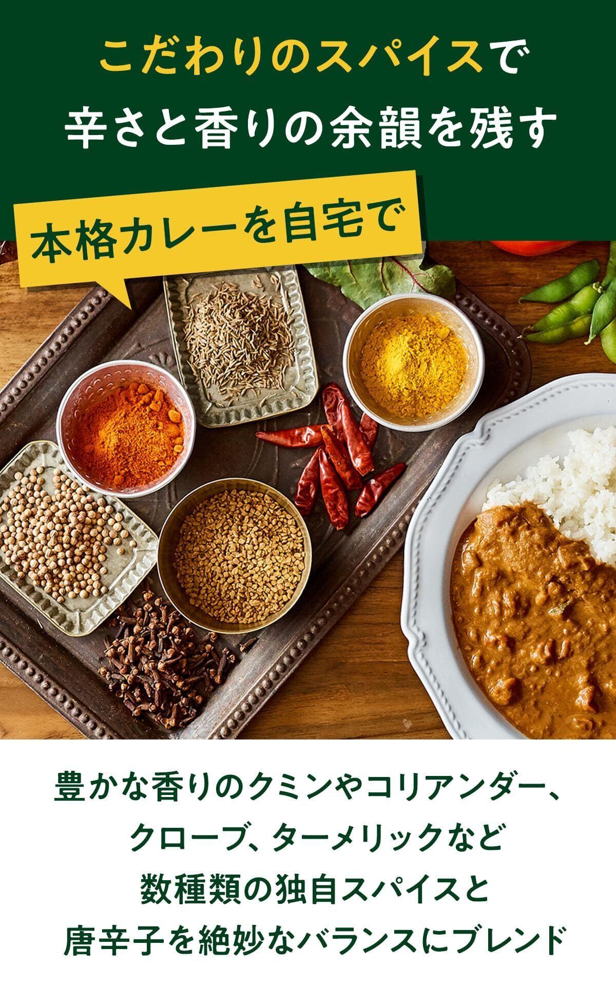 【こだわりのスパイスで辛さと香りの余韻を残す】香り豊かなクミンやコリアンダー、クローブ、ターメリックなど数種類のスパイスと唐辛子を絶妙なバランスにブレンド。口いっぱいに広がるスパイスの豊かな香りが楽しめます。さらに、甘味が特徴の玉ねぎをじっくりとソテーして加えることで、動物性油脂不使用なのにコクと深みがある味わいを一皿の中に閉じ込めました。