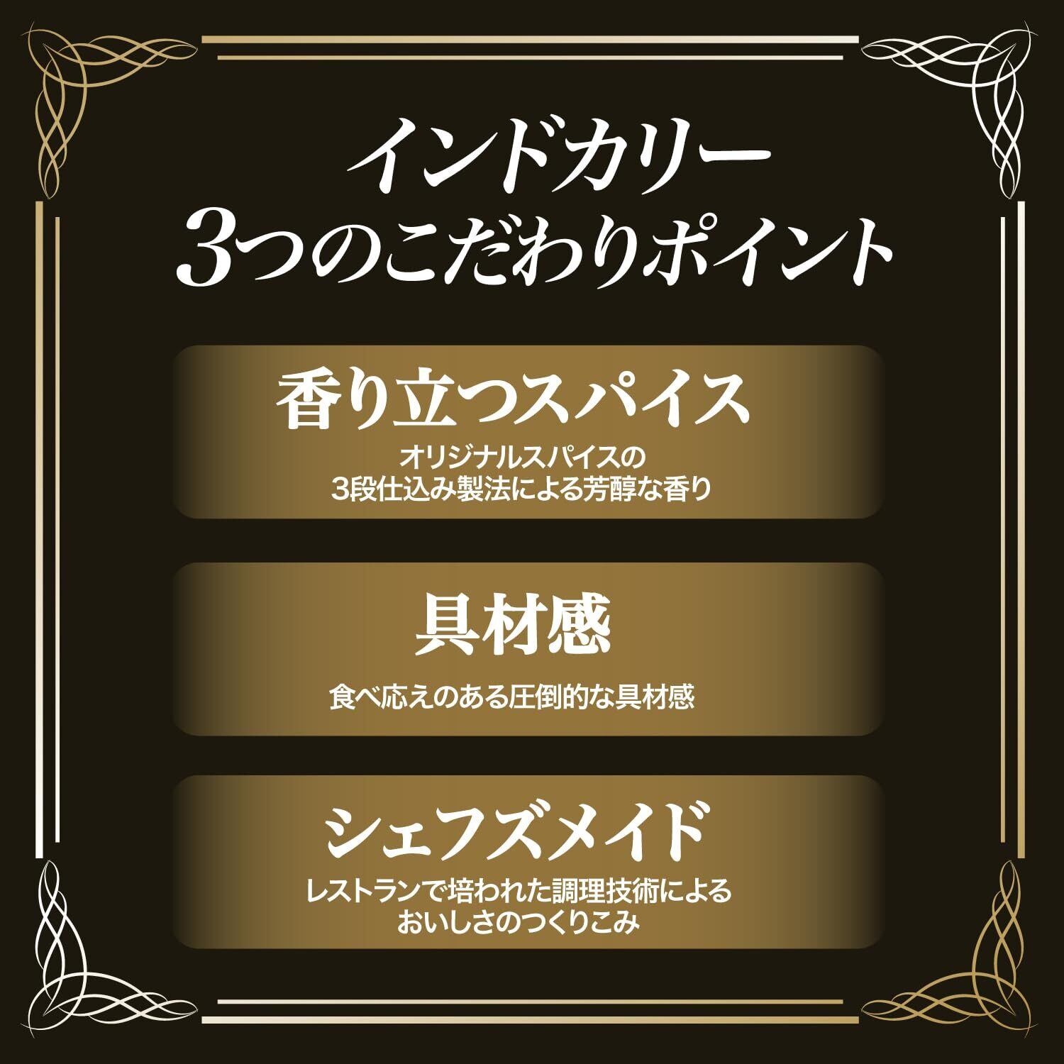 ソテーオニオン(中国製造、国内製造)、真空調理ビーフ(牛肉、発酵調味料、その他)、じゃがいも、りんごパルプ、カレー粉、トマトペースト、水あめ、食用油脂(なたね油、ラード)、 デーツピューレ、マンゴーピューレ、ヨーグルト、ビーフエキス調味料、ポークエキスパウダー、小麦粉、ウスターソース、チキンエキス、ココナッツミルクパウダー、食塩、砂糖、しょうがペースト、にんにくペースト、香辛料、酵母エキスパウダー、バター、香味油/増粘剤(加工でん粉)、着色料(カラメル)、酸化防止剤(V.E)、調味料(アミノ酸等)、香辛料抽出物、(一部に卵・乳成分・小麦・牛肉・大豆・鶏肉・豚肉・りんごを含む)