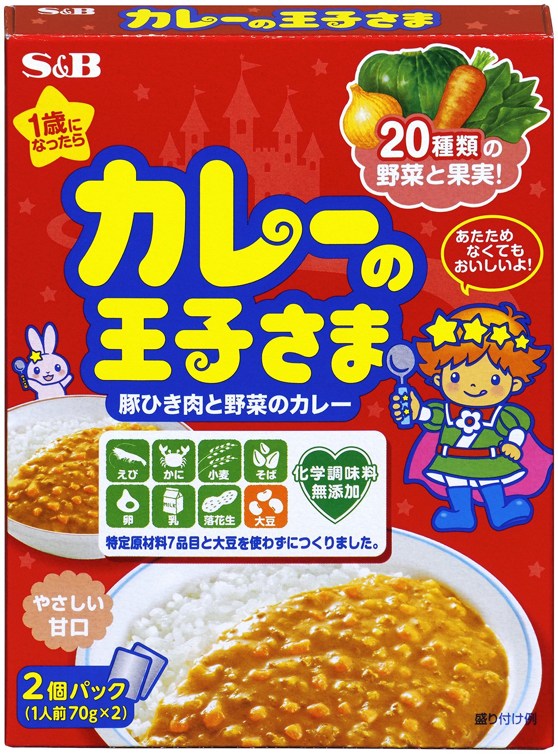 幼児向けレトルトカレーに最も期待する事柄は「たくさん野菜が摂れること」。他社の幼児向けレトルトカレーの野菜が4~9種類のところ、カレーの王子さまは19種類の野菜・果実を摂ることができます! 増粘剤として「でんぷん」を使用せずに、すりおろし野菜で作った自然なとろみを実現。豚ひき肉と野菜のカレーの2個パックです。
