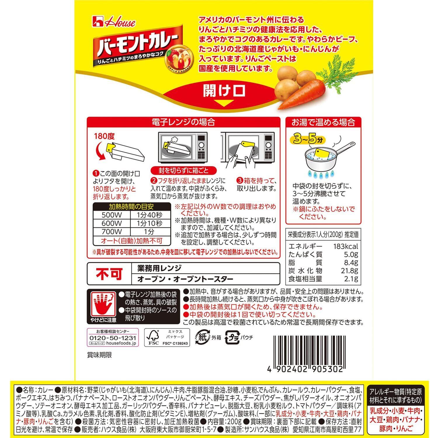 野菜(じゃがいも(北海道)、にんじん)、牛肉、牛脂豚脂混合油、砂糖、小麦粉、でんぷん、カレールウ、カレーパウダー、食塩、ポークエキス、はちみつ、バナナペースト、ローストオニオンパウダー、りんごペースト、酵母エキス、チーズパウダー、焦がしバターオイル、オニオンパウダー、ソテーオニオン、酵母エキス加工品、ガーリックパウダー、香辛料、バナナピューレ、脱脂大豆、粉乳小麦粉ルウ、トマトパウダー/調味料(アミノ酸等)、乳酸Ca、カラメル色素、乳化剤、香料、酸化防止剤(ビタミンE)、増粘剤(グァーガム)、酸味料、(一部に乳成分・小麦・牛肉・大豆・鶏肉・バナナ・豚肉・りんごを含む)