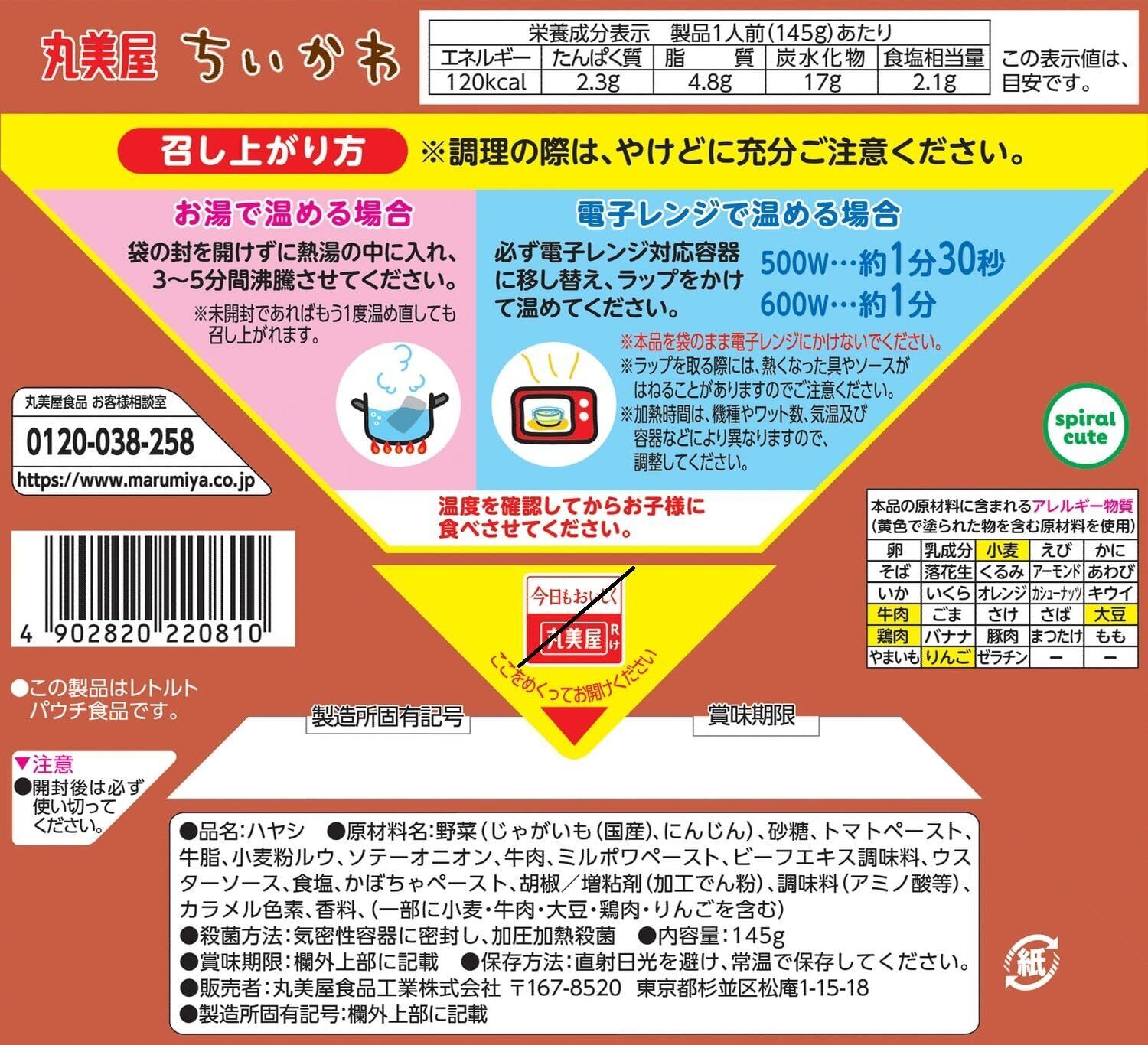 原材料:野菜(じゃがいも(国産)、にんじん)、砂糖、トマトペースト、牛脂、小麦粉ルウ、ソテーオニオン、牛肉、ミルポワペースト、ビーフエキス調味料、ウスターソース、食塩、かぼちゃペースト、胡椒/増粘剤(加工でん粉)、調味料(アミノ酸等)、カラメル色素、香料、(一部に小麦・牛肉・大豆・鶏肉・りんごを含む)