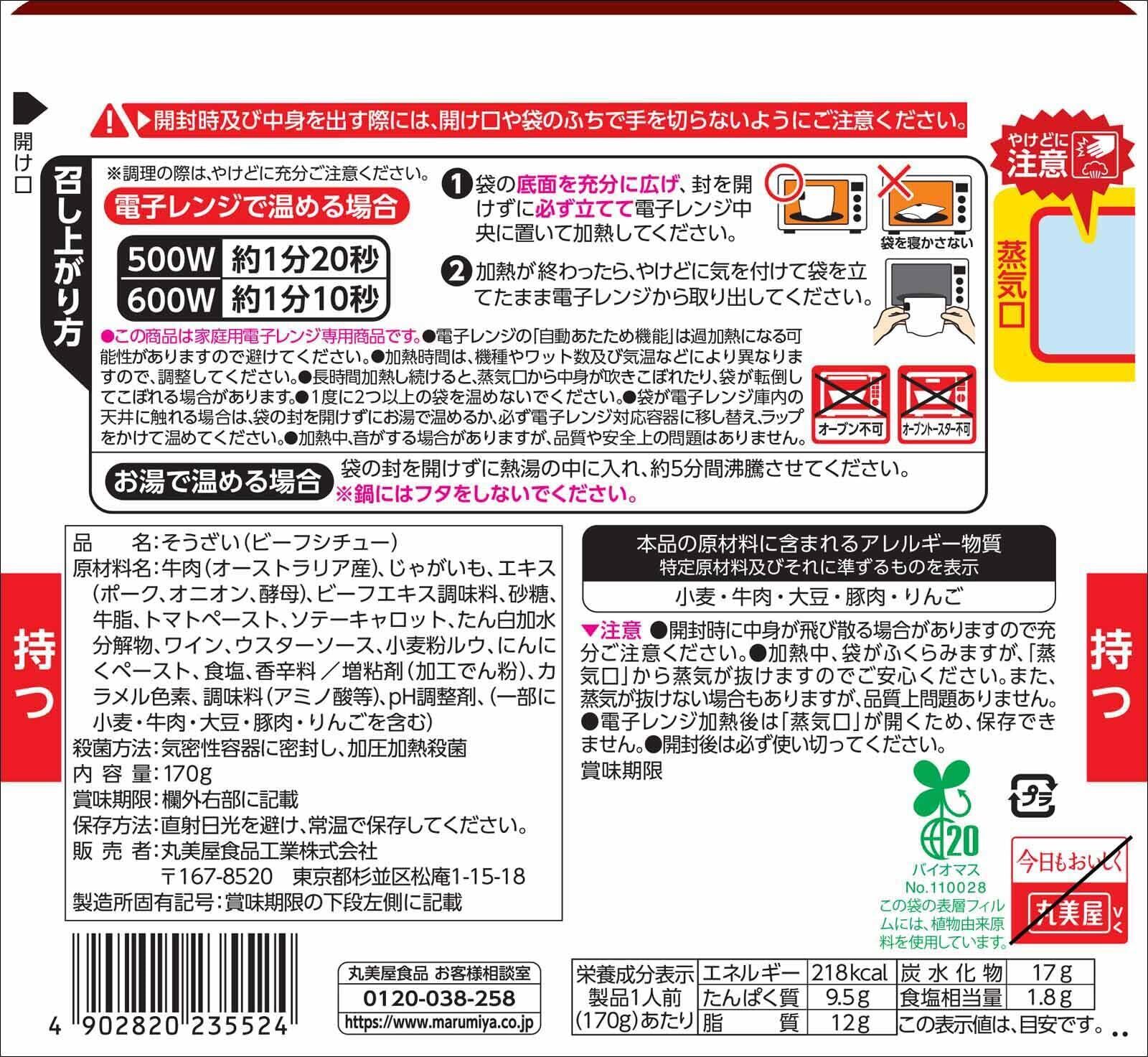 原材料:牛肉(オーストラリア産)、じゃがいも、エキス(ポーク、オニオン、酵母)、ビーフエキス調味料、砂糖、牛脂、トマトペースト、ソテーキャロット、たん白加水分解物、ワイン、ウスターソース、小麦粉ルウ、にんにくペースト、食塩、香辛料/増粘剤(加工でん粉)、カラメル色素、調味料(アミノ酸等)、pH調整剤、(一部に小麦・牛肉・大豆・豚肉・りんごを含む)