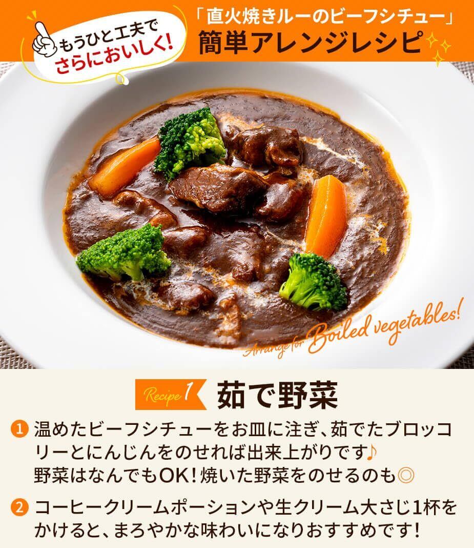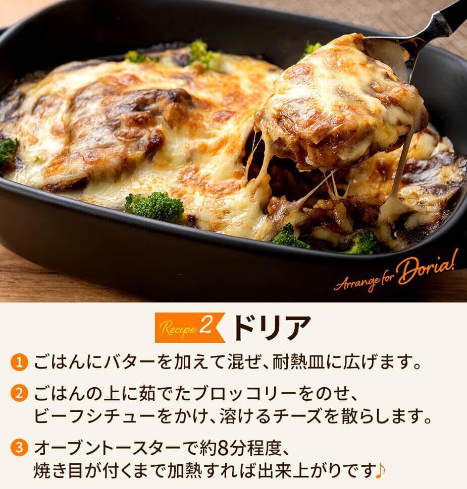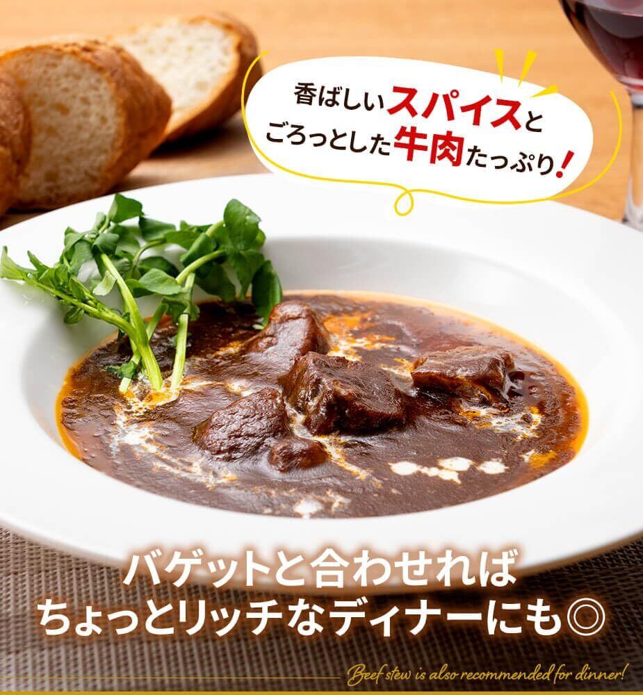 他商品と比較すると1.5倍にあたる60gの牛肉を使用しています。ごろっとしたお肉がたっぷりで食べ応えのあるシチューに仕上げました。