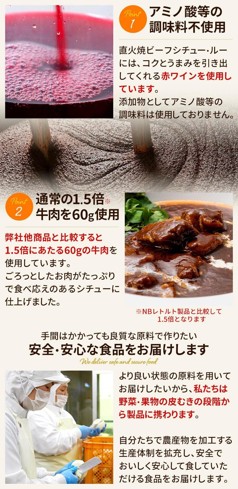 アミノ酸等の調味料不使用!直火焼きビーフシチュー・ルーには、コクとうまみを引き出してくれる赤ワインを使用しています。添加物としてアミノ酸等の調味料は使用しておりません。