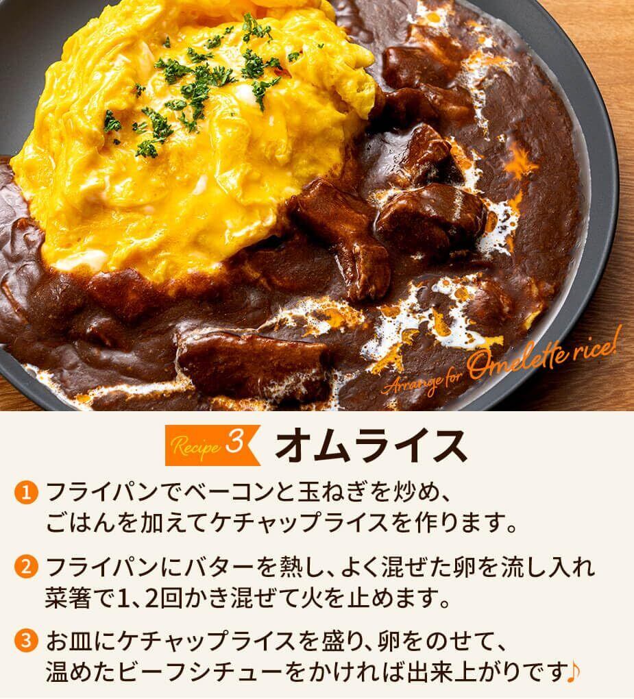 牛肉(メキシコ産)、赤ワイン、シチュールウ、デミグラスソース、ソテーオニオン、りんごピューレ、トマトペースト、ビーフエキス、バター、酵母エキス、砂糖、肉エキス、おろしにんにく、香辛料/カラメル色素、(一部に小麦・乳成分・牛肉・大豆・鶏肉・豚肉・りんごを含む)