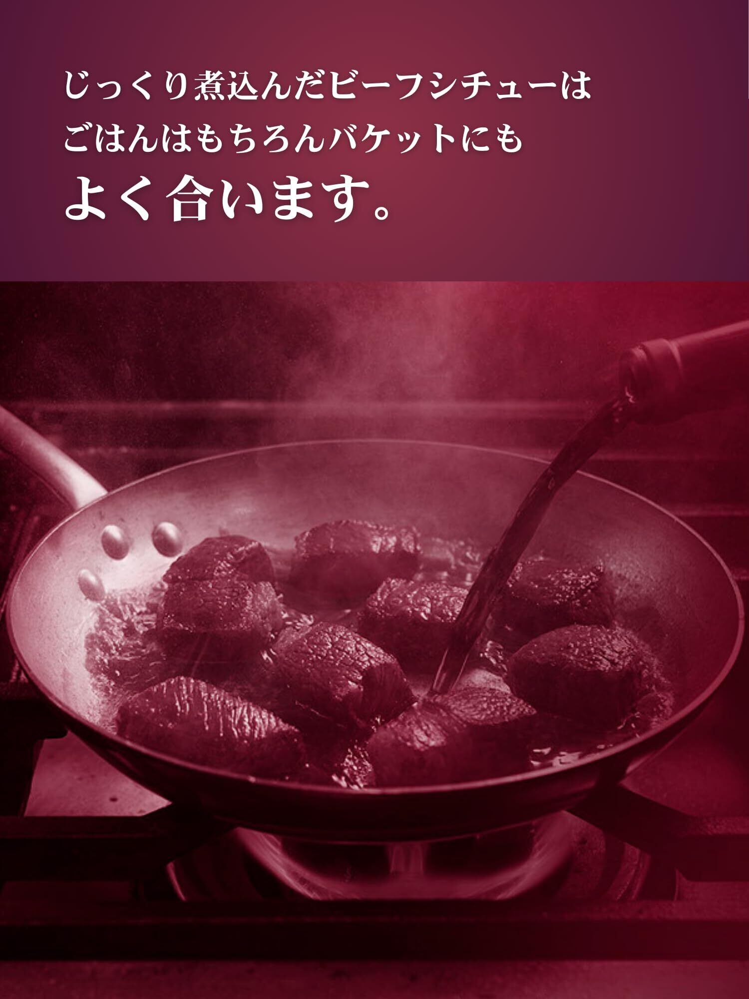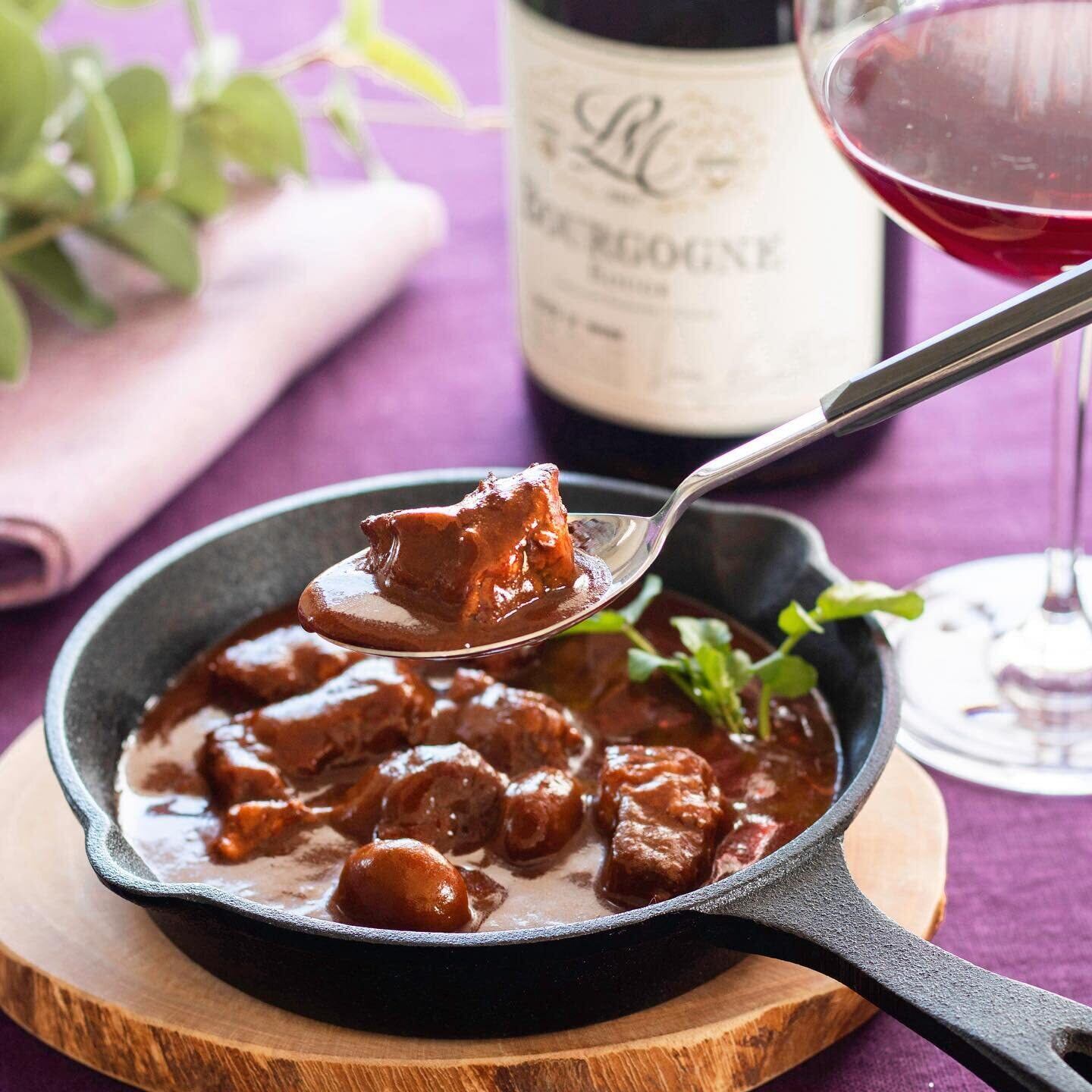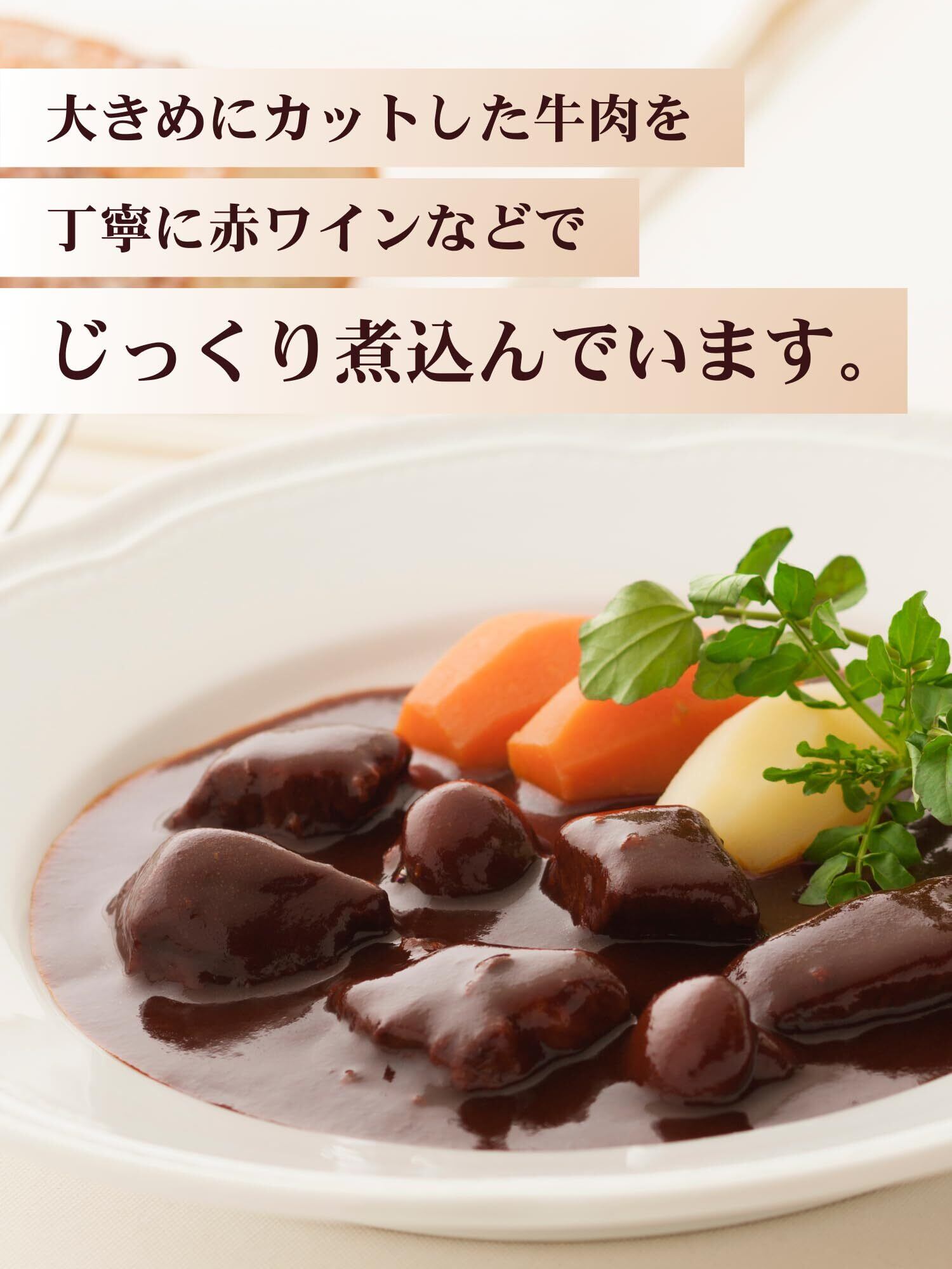 ビーフシチューを手軽に ソテーした牛肉を、こだわりのドミグラスソースと赤ワインでじっくり煮込みました。フォン・ド・ヴォーと赤ワインの香り豊かなビーフシチューをお楽しみください。