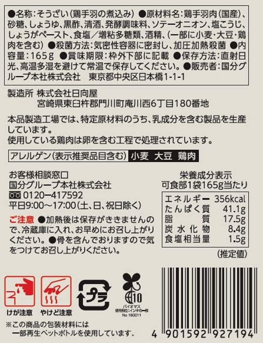 原材料:鶏手羽肉(国産)、砂糖、しょうゆ、黒酢、清酒、発酵調味料、ソテーオニオン、塩こうじ、しょうがペースト、食塩/増粘多糖類、酒精、(一部に小麦・大豆・鶏肉を含む)