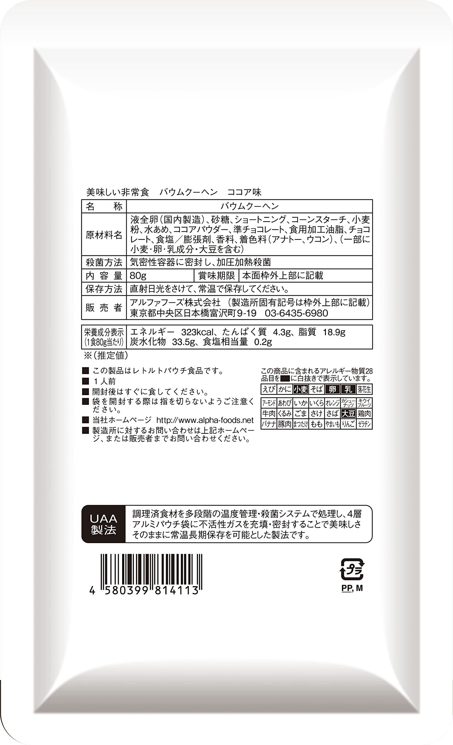 【UAA食品®美味しい非常食】 ・手軽に美味しくエネルギー補給 ・常温のまま、温めずすぐに食べれる。 ・レトルト臭がほとんどなく、出来立てに近い美味しさ。 ・常温で5年7カ月の長期保存。 ・しっとりくちどけの良いスティックタイプのバウムクーヘン 【UAA(ウルトラアンチエイジング)製法とは?】 原材料を下処理・前処理後、調理した食材を酸素と光を遮断するバリヤー性のある4層アルミパウチ袋に入れ、 一旦空気を排出し、新たに不活性ガスを充填して密封し、コンピューター制御による多段階の昇温・降温殺菌 システムで長期保存を可能とした製法。これらの行程により、食品の酸化、劣化を抑える事で、保存料などを 添加することなく、常温長期保存を可能にしています。